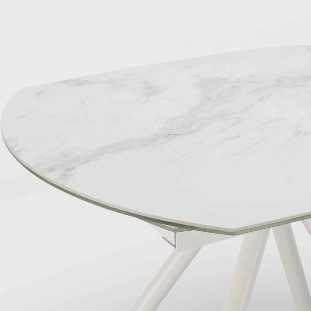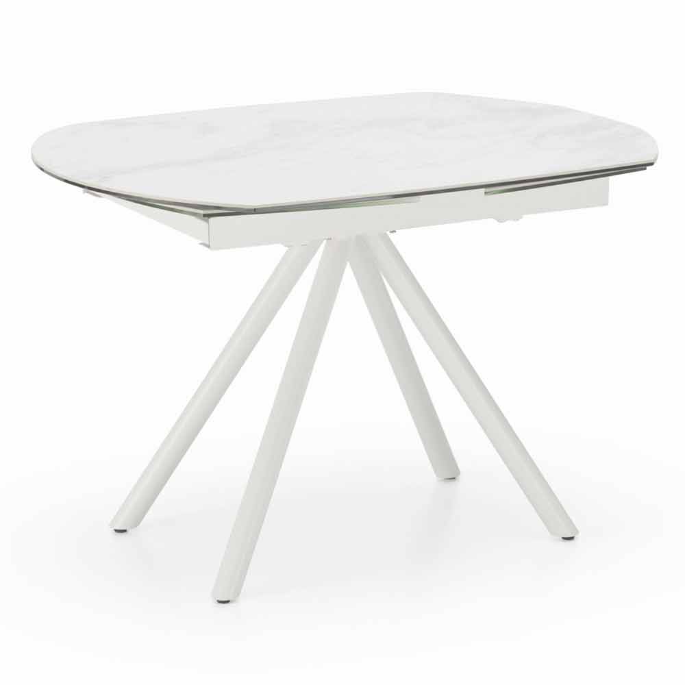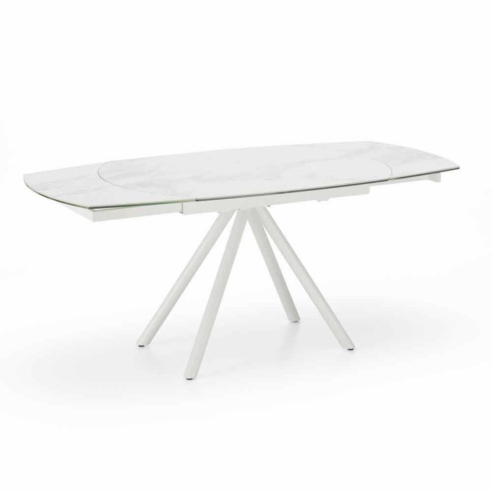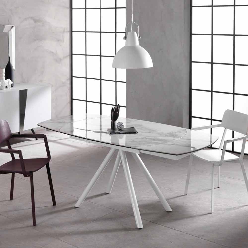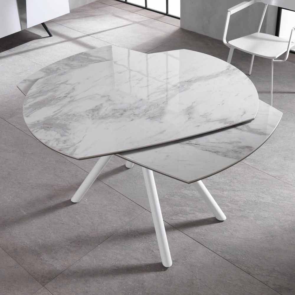Mesa extensible moderna con tapa de cerámica efecto mármol, Lozzolo Lozzolo es una mesa extensible con un diseño único e innovador; con una ligera presión simplemente gire la parte superior para extender la mesa. Realizado con estructura y patas en metal pintado de blanco y con tapa de cerámica efecto mármol. Gracias a su estilo y diseño será perfecto para amueblar tus estancias con elegancia y singularidad.