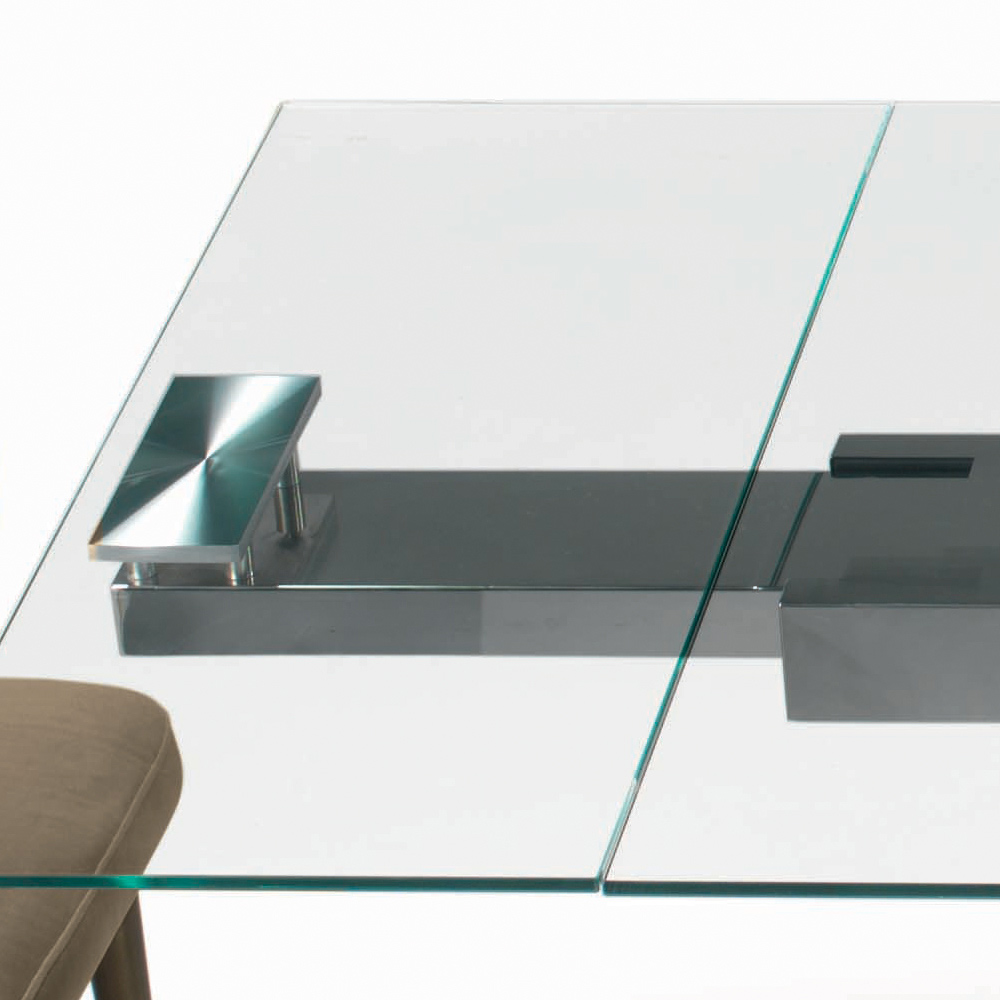Mesa de salón extensible con extensiones integradas, tapa de cristal , canto recto , base chapada en nogal canaletto y pies regulables. Gracias a la forma de la base y a los acabados de la tapa disponibles, la mesa es capaz de dar un toque de movimiento y elegancia a cualquier ambiente diario y contract. Los materiales garantizan funcionalidad y practicidad para tener un producto no sólo visualmente muy bonito sino también utilizable en cualquier ocasión.
