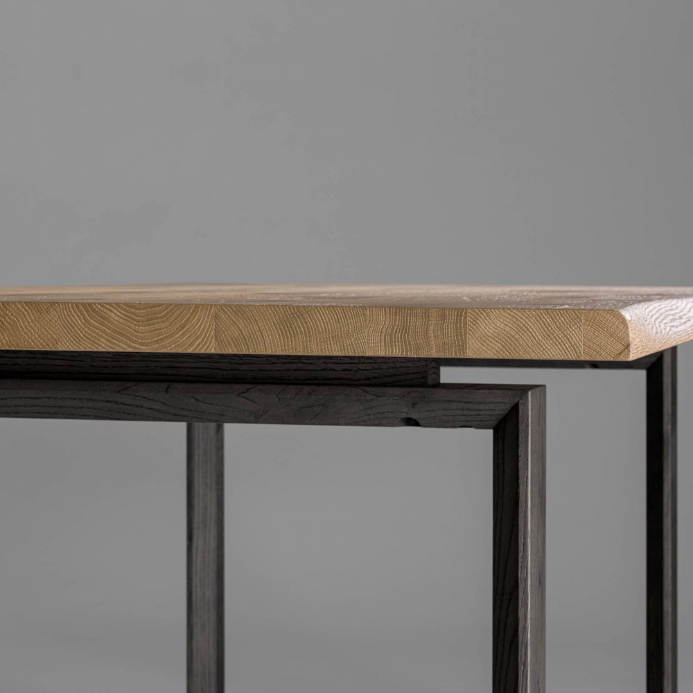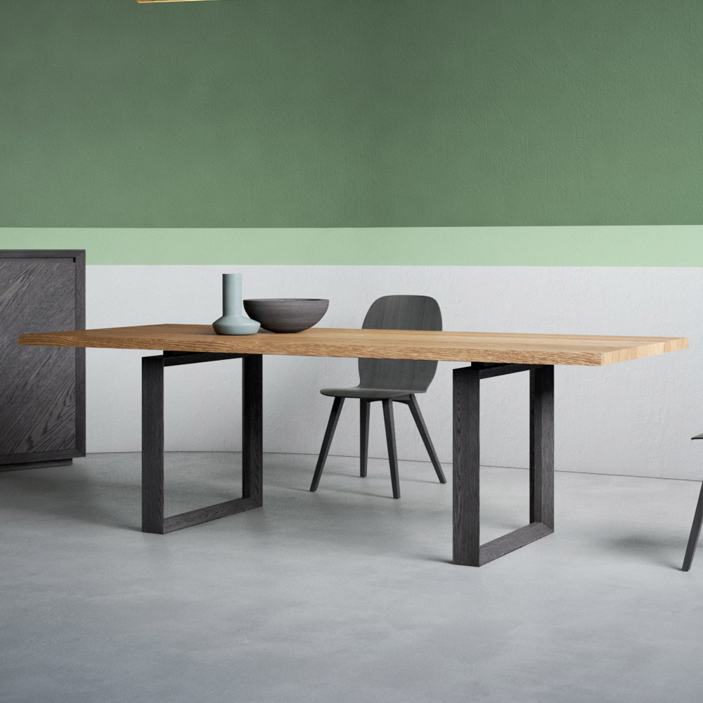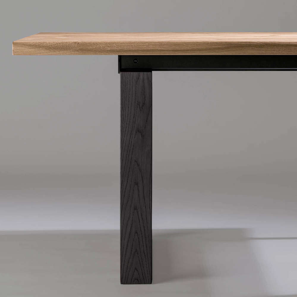 Mesa extensible con tapa biselada chapa de roble natural sobre aglomerado de álamo y canto descortezado. Patas chapadas y biseladas en madera maciza pintada en roble ahumado. Se incluyen 2 extensiones de 50 cm cada una, una debajo de la mesa y otra externa.