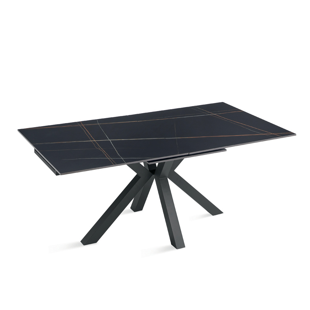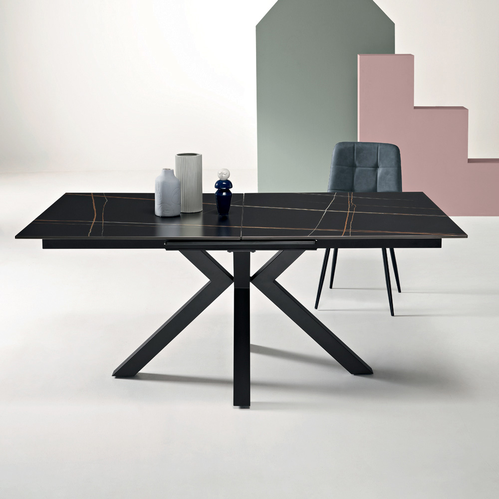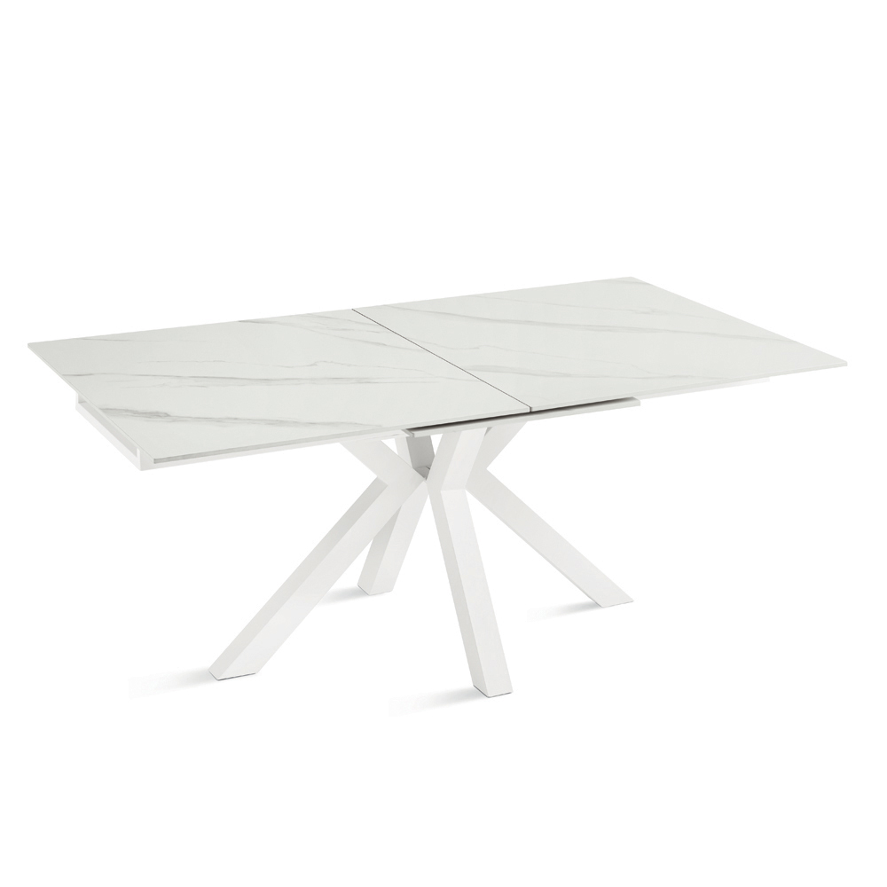 Mesa de comedor extensible de estilo contemporáneo, ideal para realzar tu comedor o sala de estar . La superficie de piedra sinterizada con efecto mármol combina una estética refinada con funcionalidad, mientras que la base de metal pintado garantiza estabilidad y robustez.