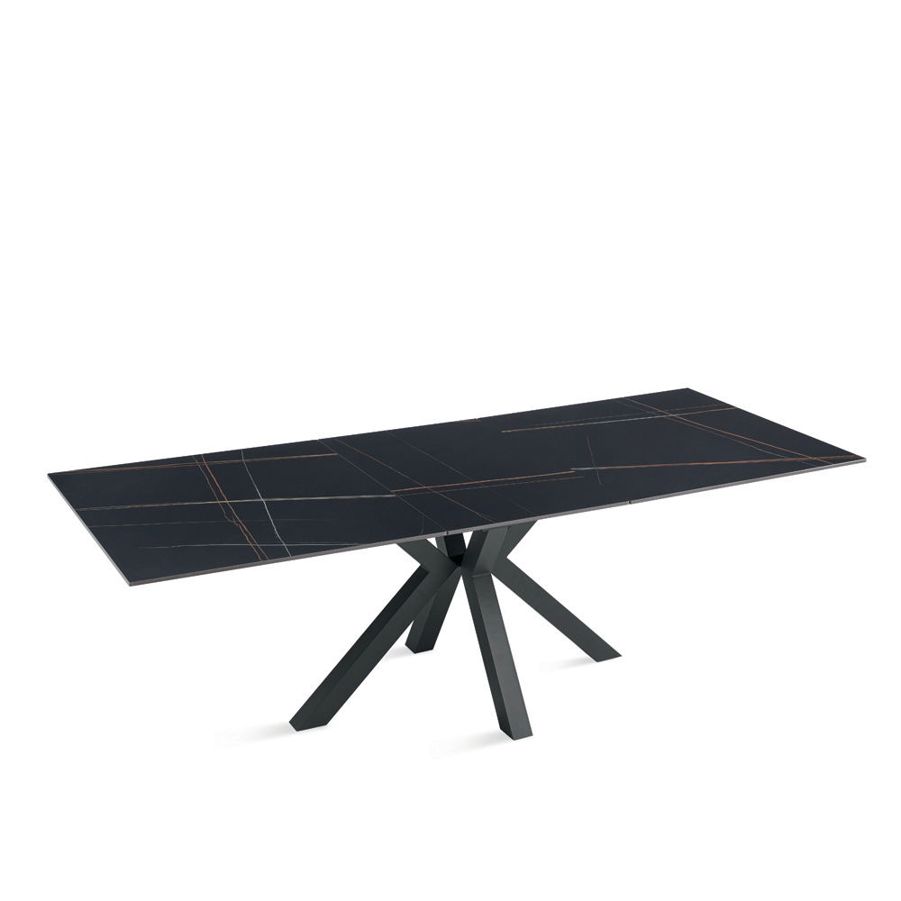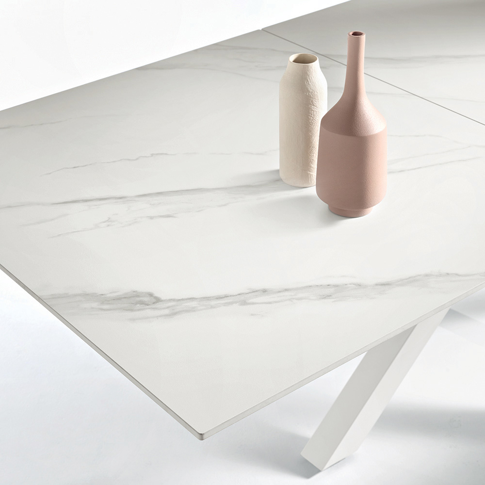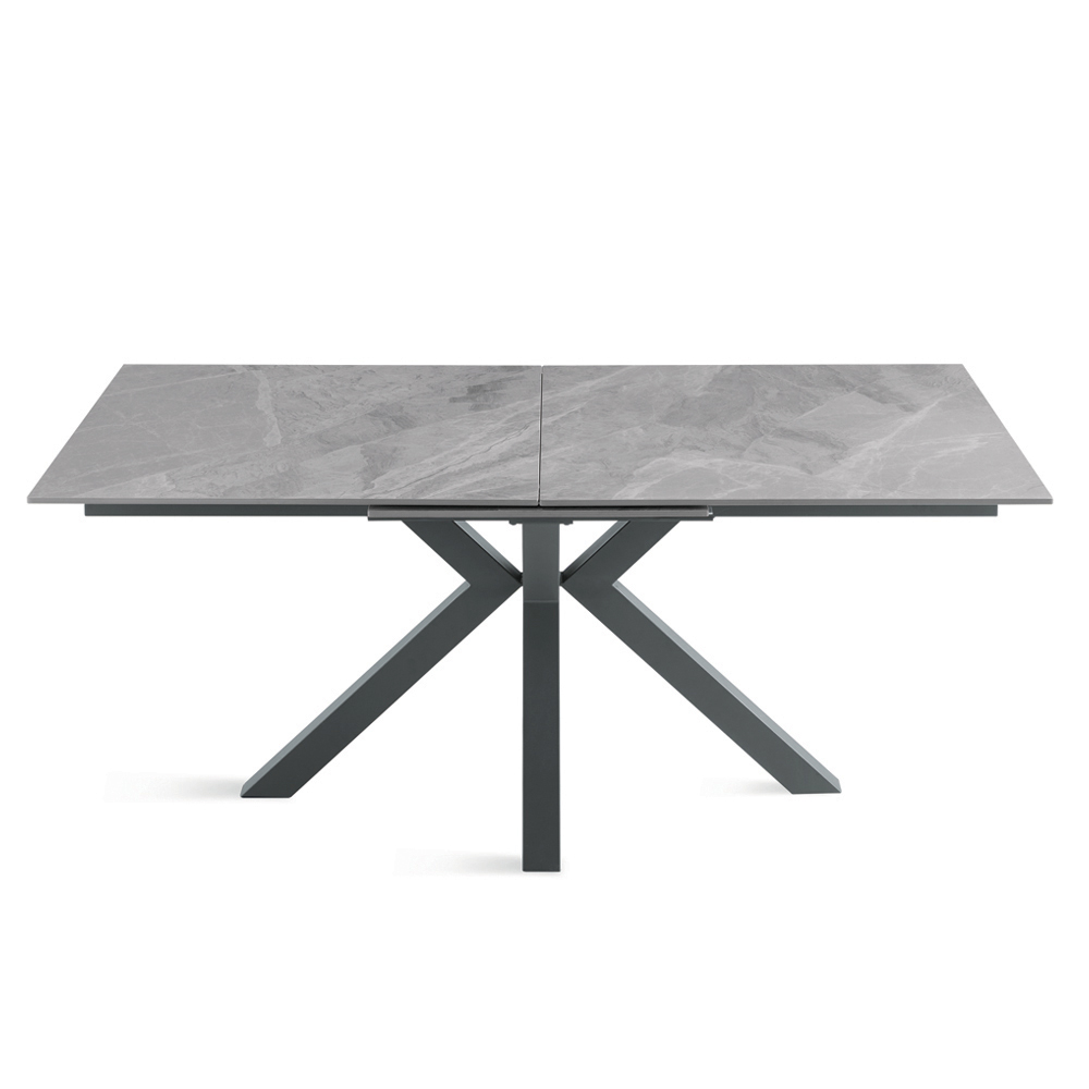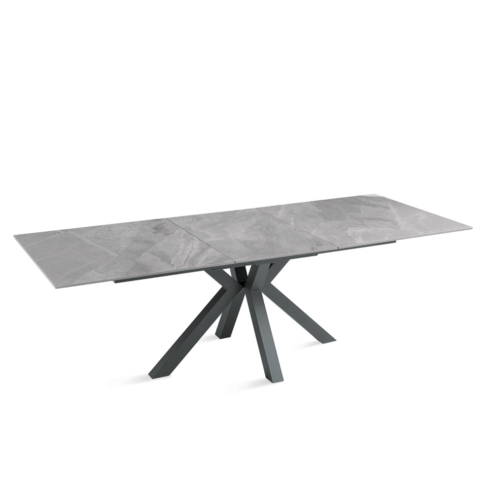 Mesa de comedor extensible de estilo contemporáneo, ideal para realzar tu comedor o sala de estar . La superficie de piedra sinterizada con efecto mármol combina una estética refinada con funcionalidad, mientras que la base de metal pintado garantiza estabilidad y robustez.