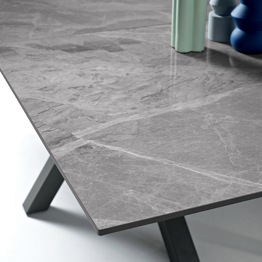 El sistema de extensión central permite ampliar rápidamente la superficie de la mesa, lo que la hace ideal tanto para el uso diario como para recibir invitados. Disponible en diversas combinaciones de acabados para la superficie y la base, se adapta fácilmente a diferentes estilos y paletas de colores.