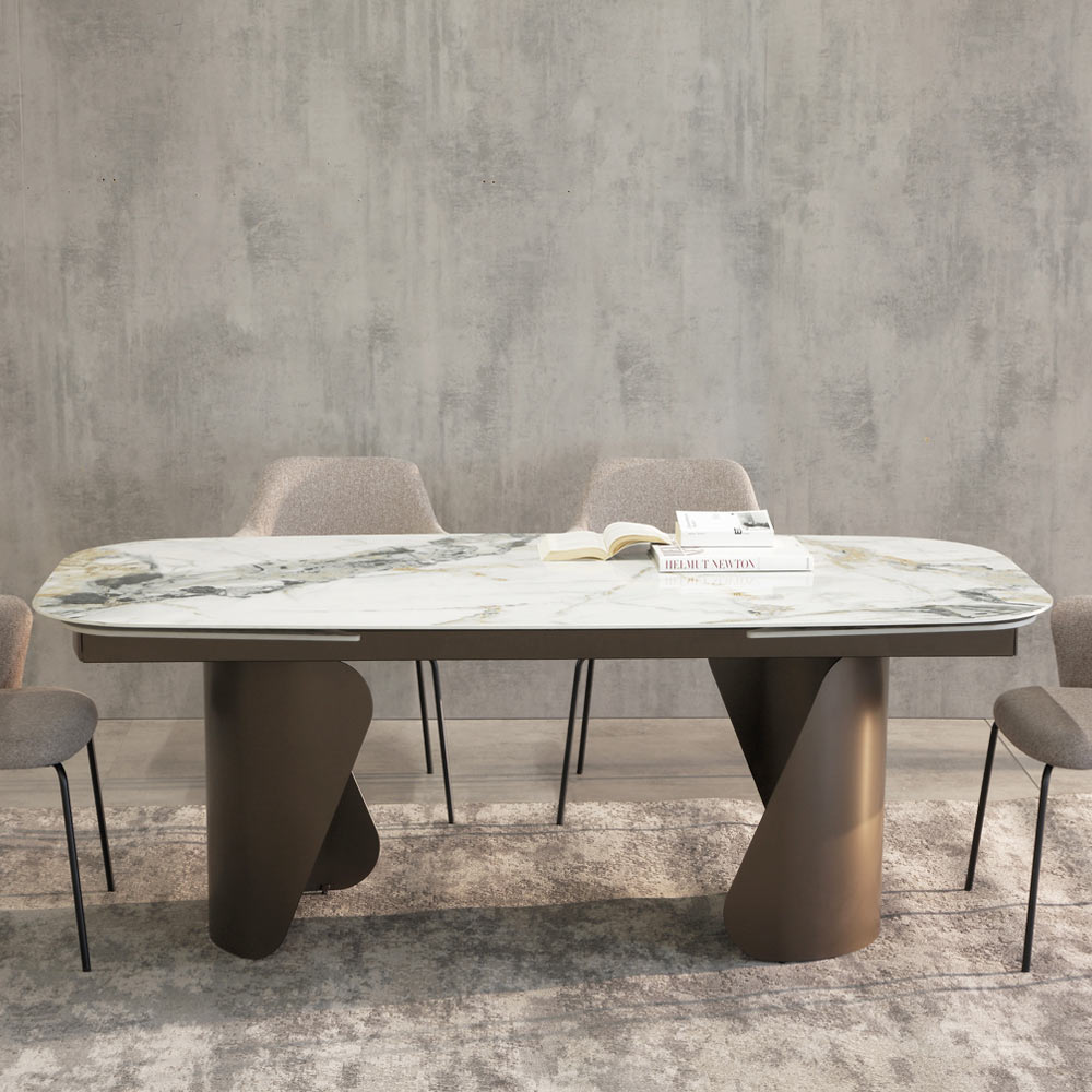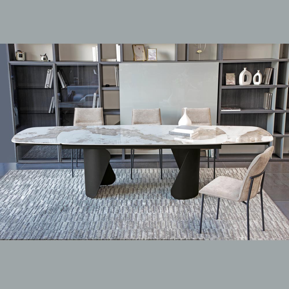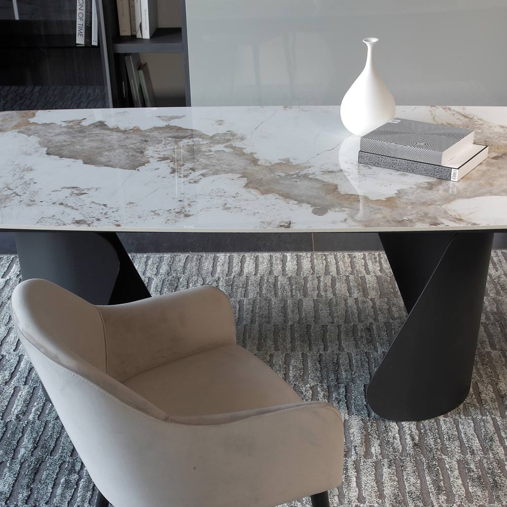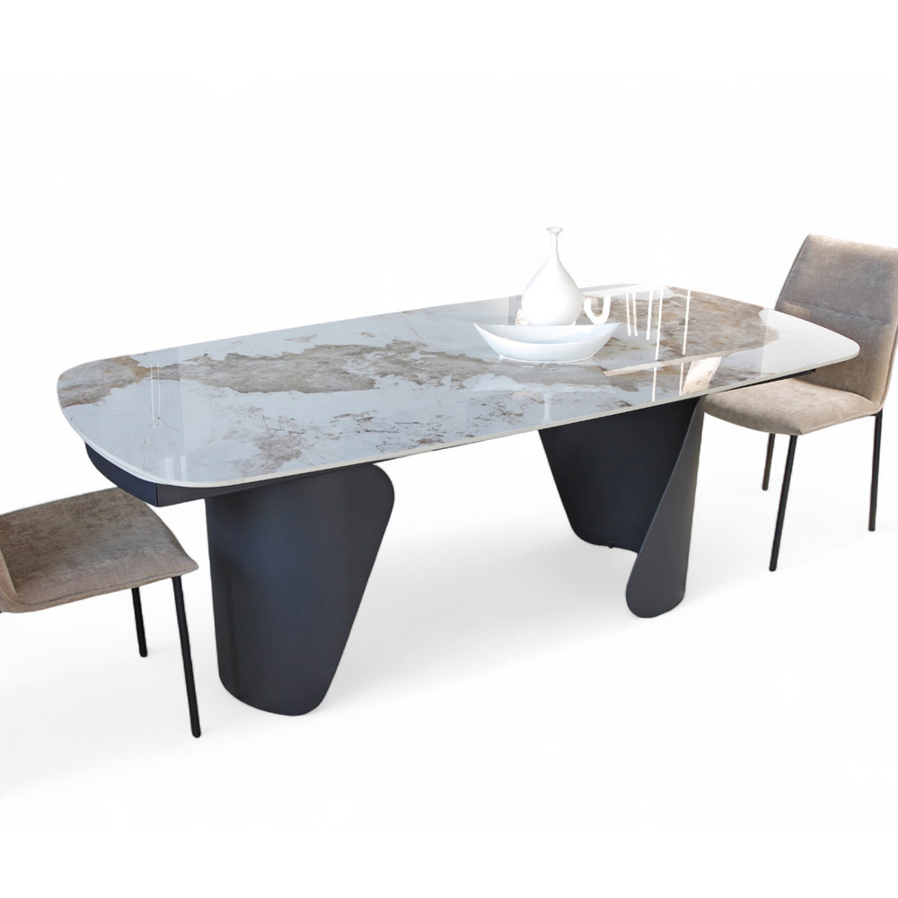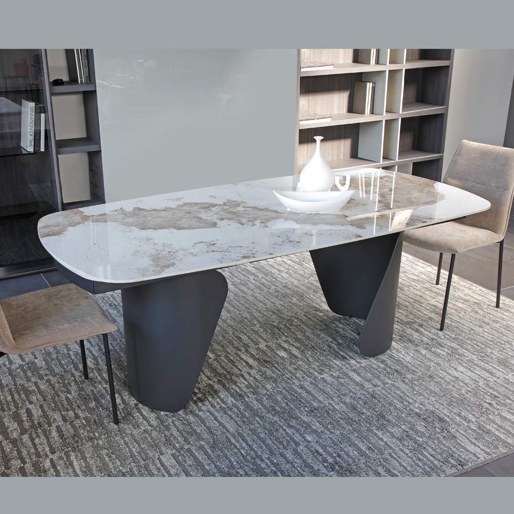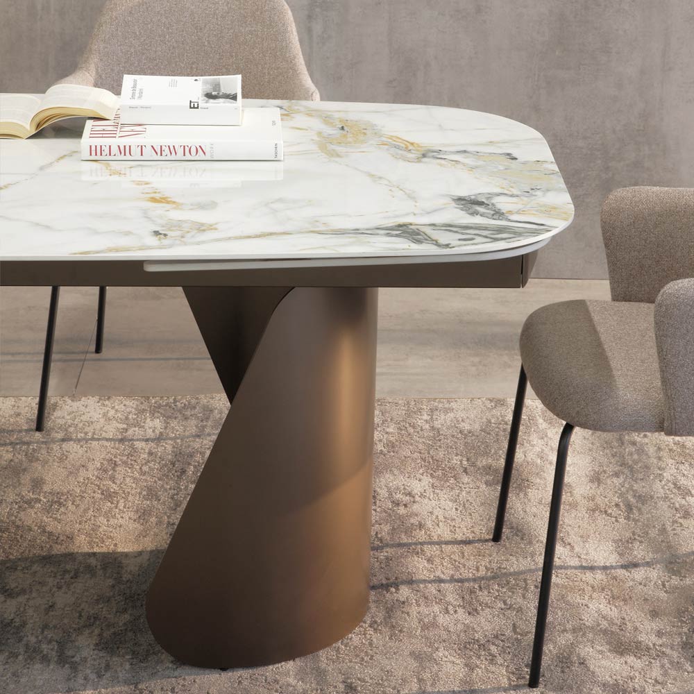 La base escultural de metal pintado aporta estabilidad y un carácter marcado a la mesa, creando un interesante contraste de materiales con la superficie. Las formas geométricas asimétricas de las patas aportan un toque artístico y sofisticado al diseño general.