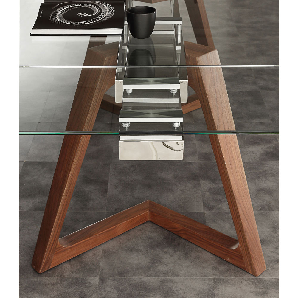 Sus bases de madera maciza, de forma geométrica y envolvente, aportan un toque de calidez natural y modernidad al ambiente, haciéndolo perfecto para cualquier interior, desde el clásico al contemporáneo. El sofisticado diseño de la mesa no sólo amplifica la percepción del espacio con su ligereza visual, sino que también garantiza una estabilidad y resistencia que sólo los materiales de alta calidad pueden ofrecer.