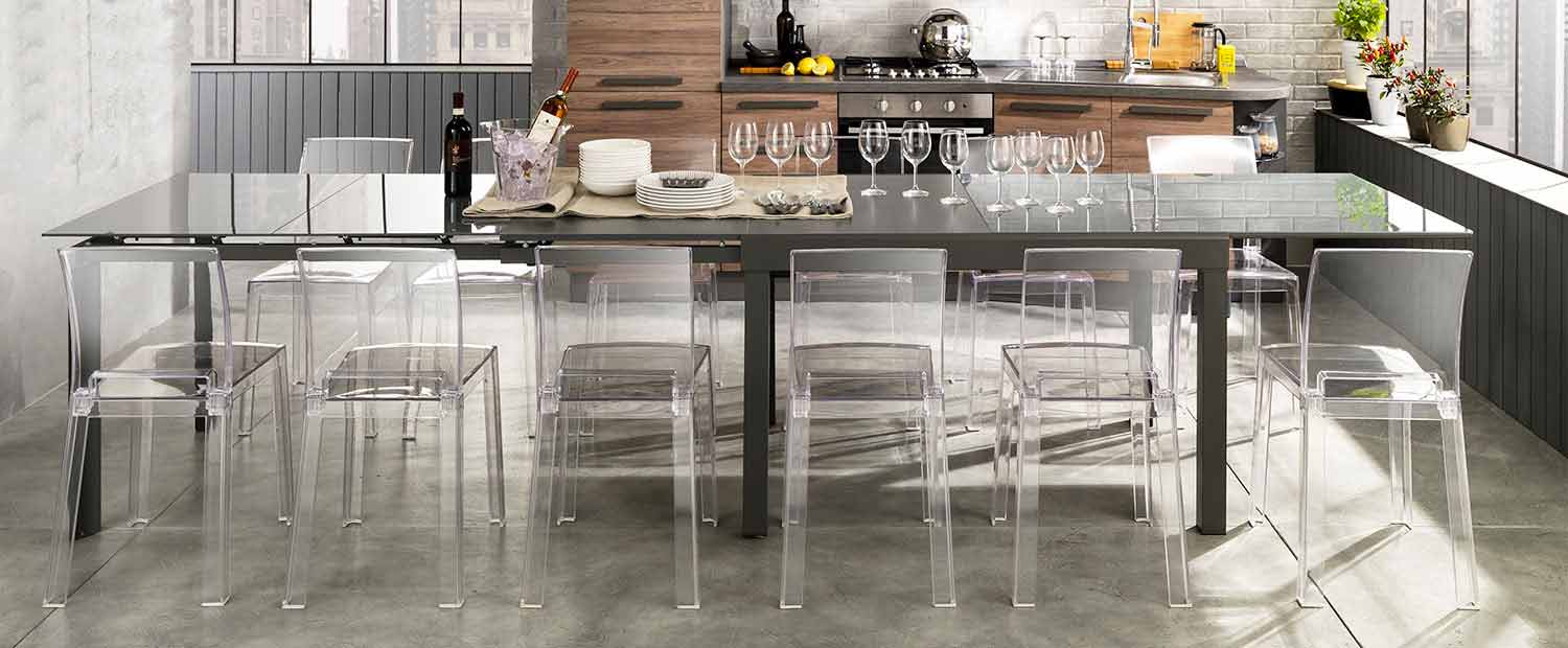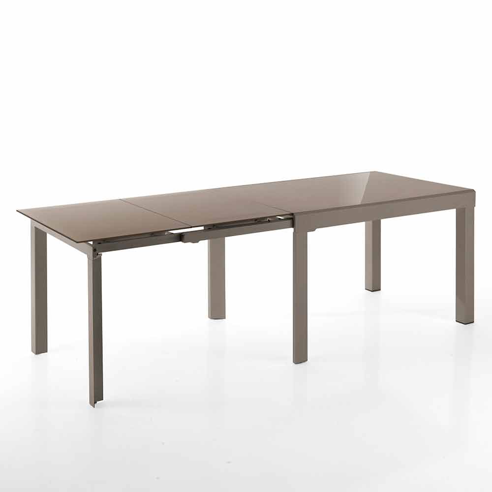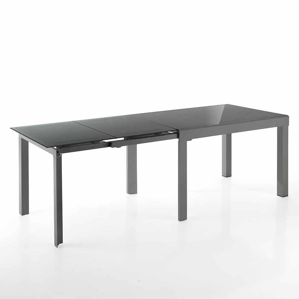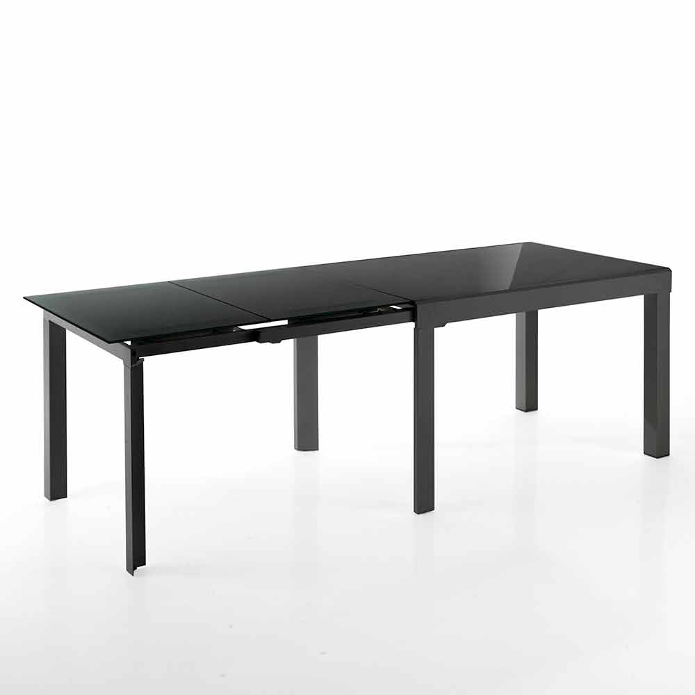 Romualdo es una práctica mesa de comedor extensible realizada con una tapa de vidrio templado (espesor 8 mm) y una base de metal pintado, disponible en tres acabados diferentes: