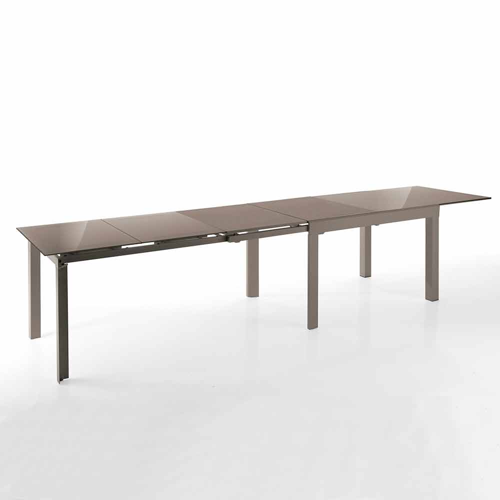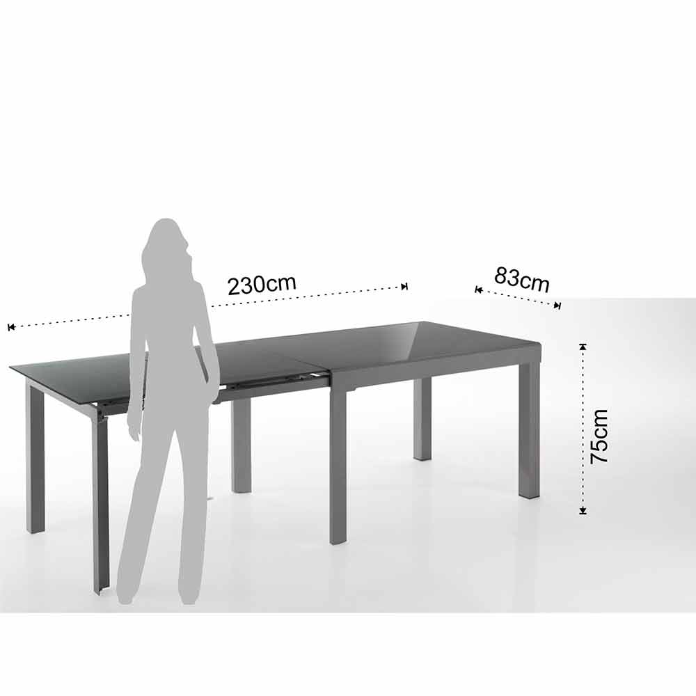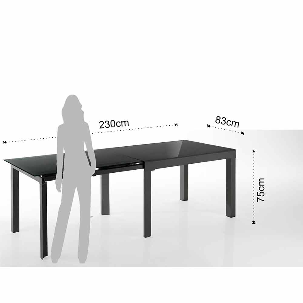 Su funcionalidad está dada por cuatro extensiones , dos en vidrio colocadas debajo de la parte superior y las otras dos en Mdf, que permiten alcanzar una longitud máxima de 350 cm.