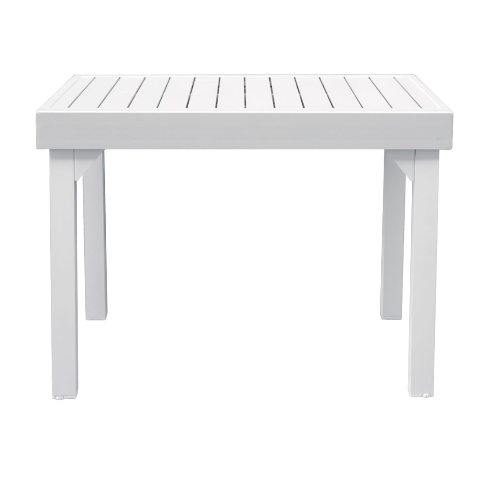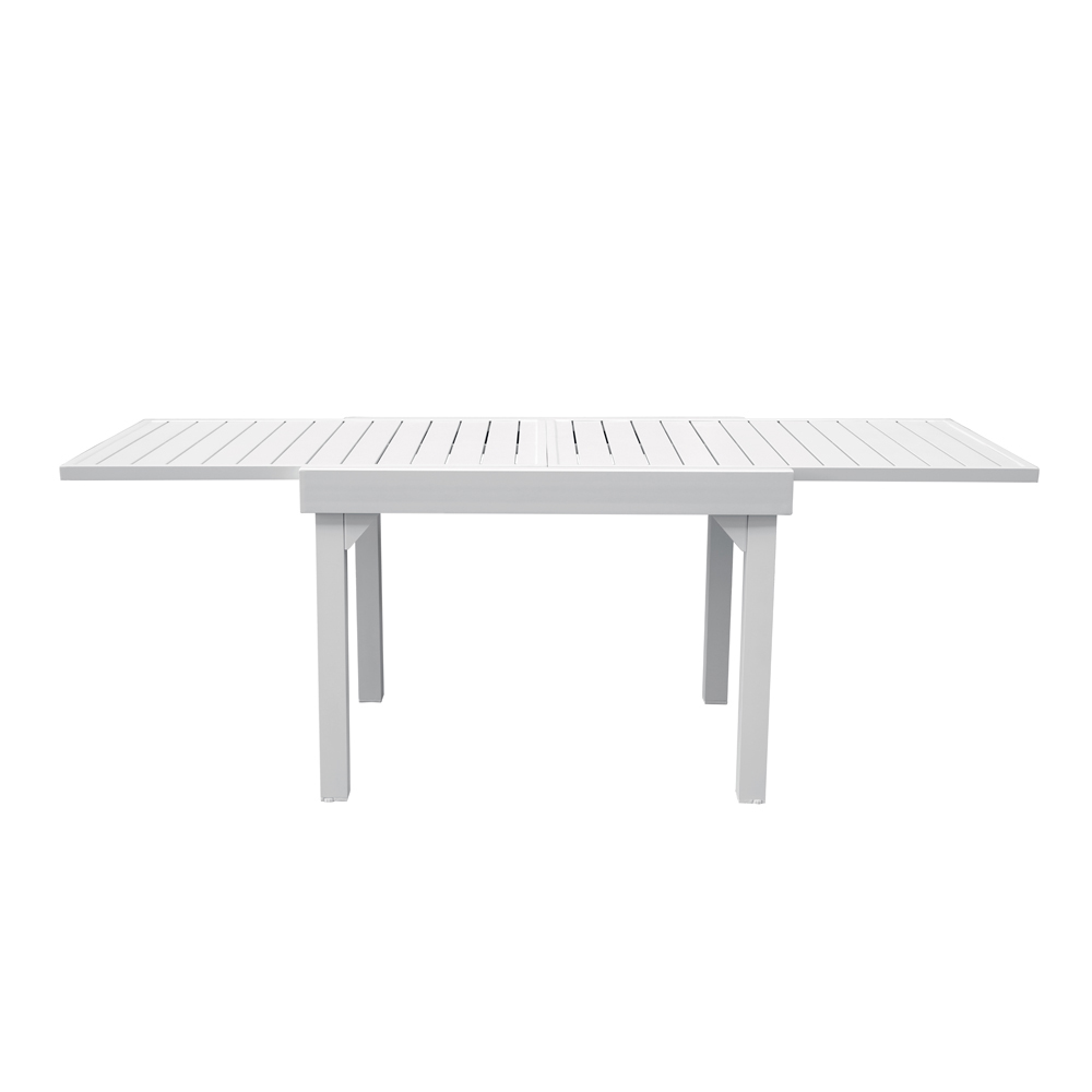 Aporta estilo y funcionalidad a tus espacios exteriores con esta mesa de aluminio blanca de diseño moderno y minimalista. Su tapa de listones no sólo le da un aspecto elegante, sino è que también es práctica, duradera y fácil de limpiar.