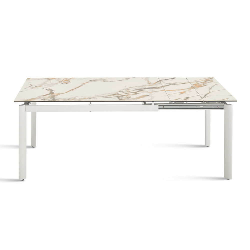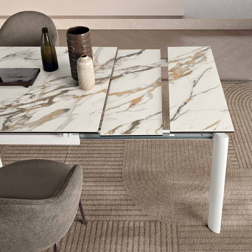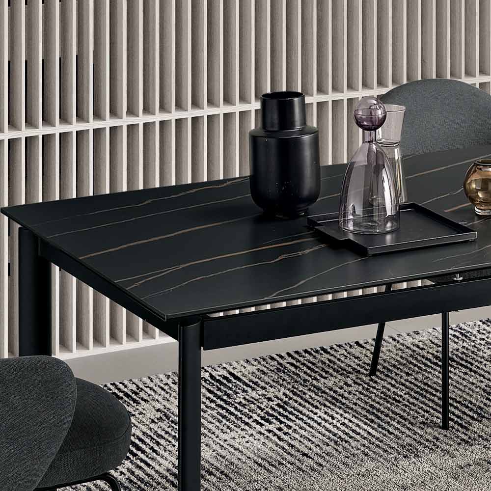 Una elegante mesa extensible de diseño minimalista, ideal para dar un toque de estilo a tu comedor o sala de estar . La estructura de metal pintado sostiene una refinada superficie de gres porcelánico con efecto mármol , diseñada para un uso práctico y versátil en el día a día.