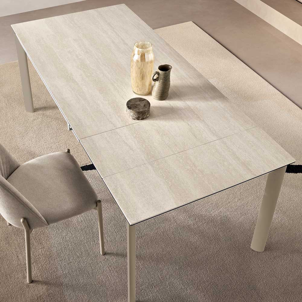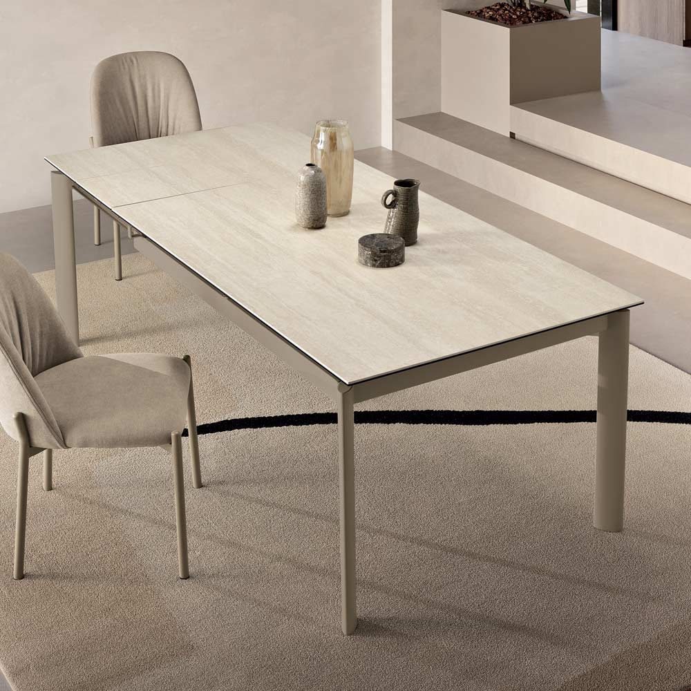 Las patas ubicadas en las esquinas liberan espacio bajo la superficie, mejorando la comodidad al sentarse y realzando la estética minimalista de la mesa. La superficie parece ligeramente elevada para alojar discretamente las extensiones, manteniendo un aspecto ordenado incluso cuando está cerrada.