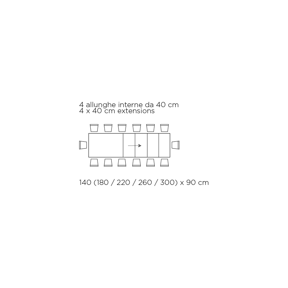 L 140 (300) x P 90 x H 75 cm 14 plazas extensible con cuatro extensiones internas de 40 cm cada una;