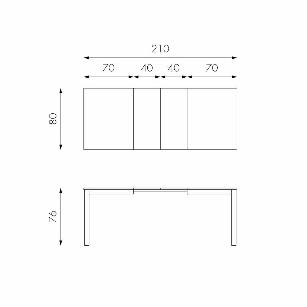 Mesa con base en madera maciza de haya y tapa en melamina. Tiene 2 extensiones de 40 cm cada una, alojadas dentro de la mesa. Disponible en diferentes colores.