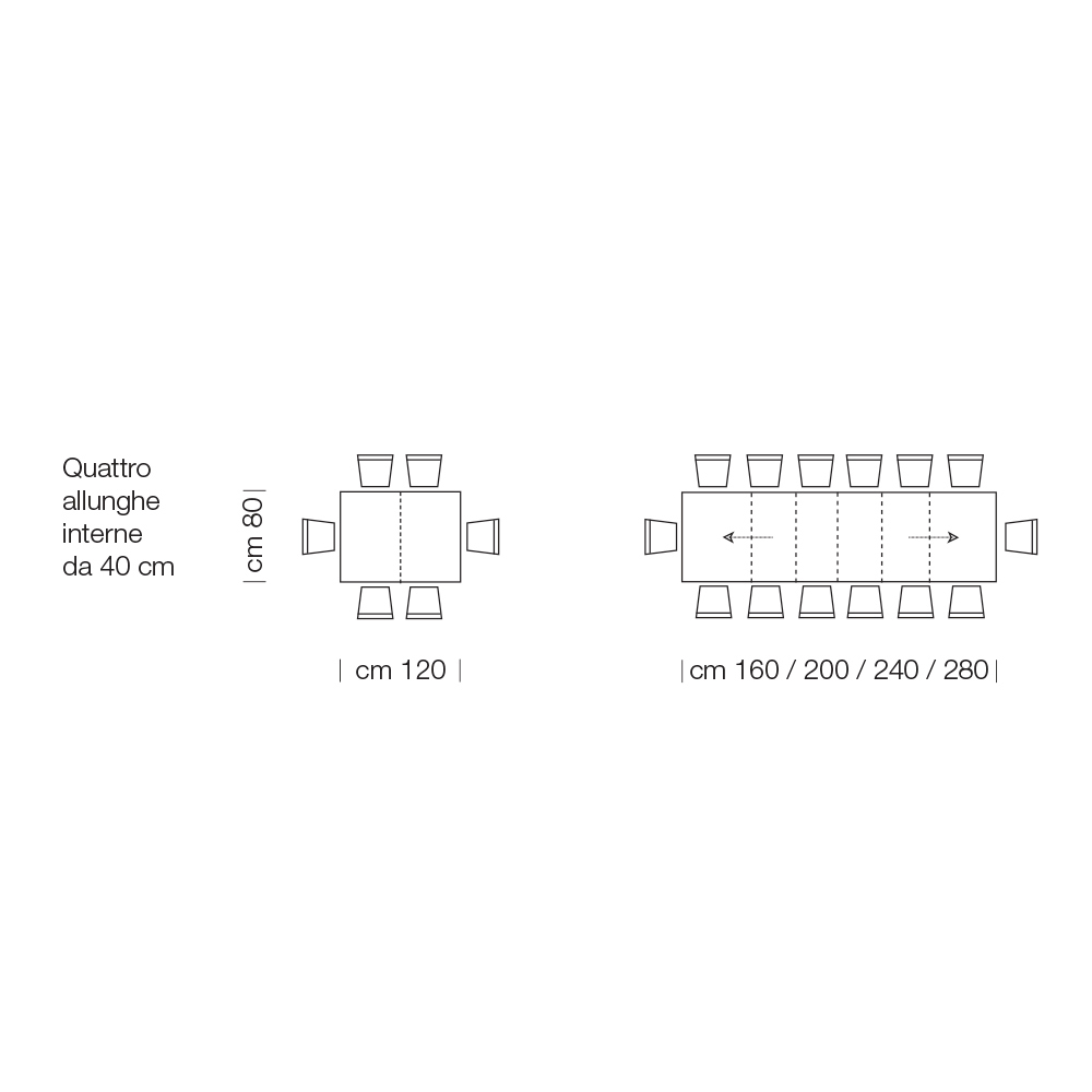 L 120 (280) x P 80 x H 77 cm 14 plazas extensible con cuatro extensiones internas de 40 cm;