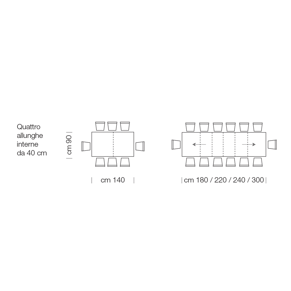 L 140 (300) x P 90 x H 77 cm 14 plazas extensible con cuatro extensiones internas de 40 cm;