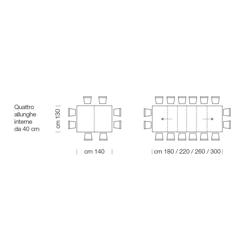 L 140 (300) x P 130 x H 77 cm 16 plazas extensible con cuatro extensiones internas de 40 cm;