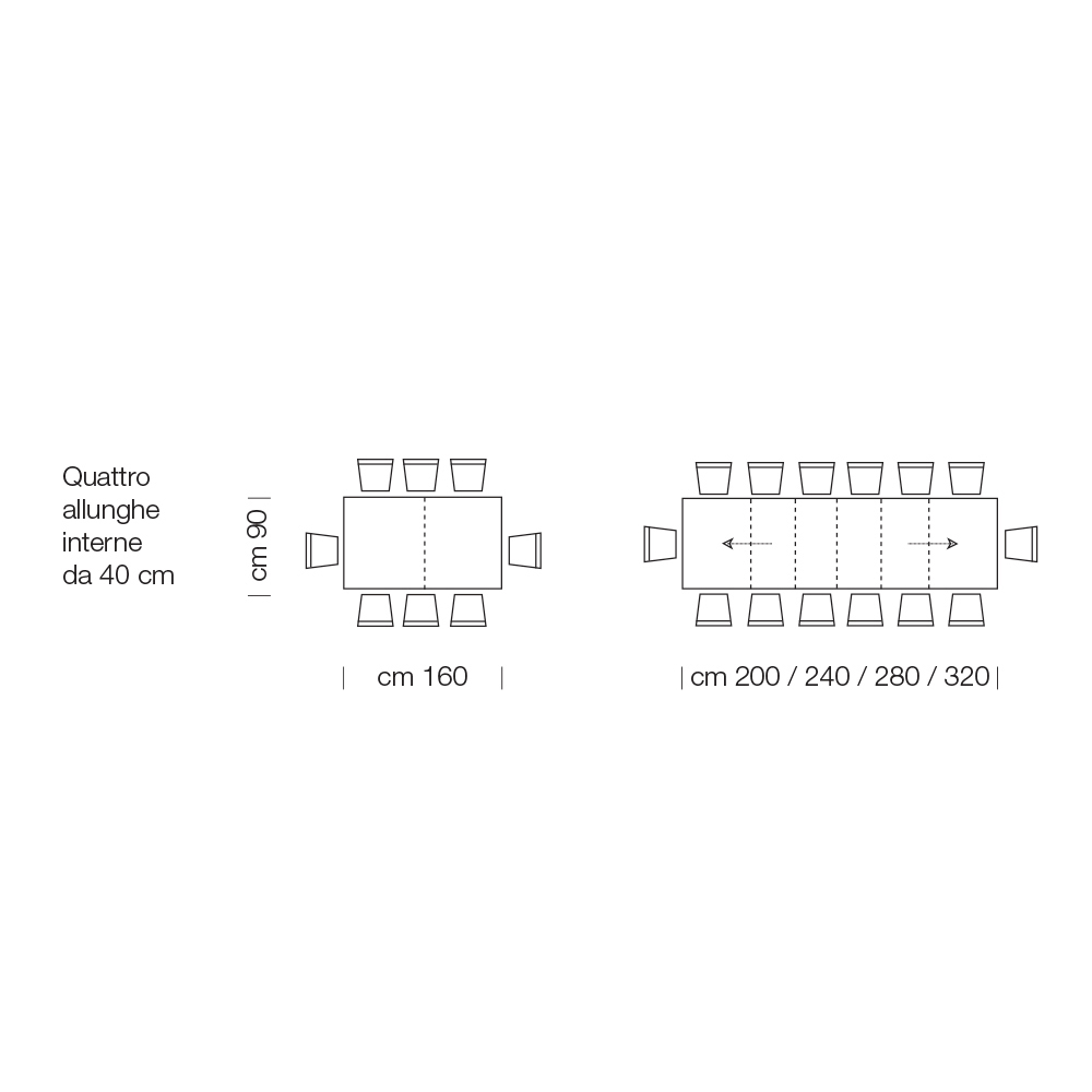 L 160 (320) x P 90 x H 77 cm 14 plazas extensible con cuatro extensiones internas de 40 cm;