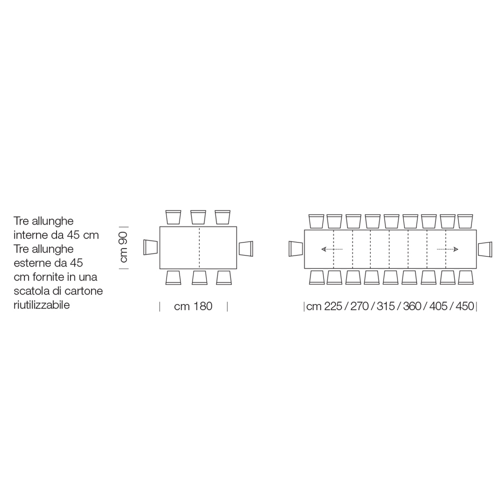 L 180 (450) x P 90 x H 77 cm 20 plazas extensible con seis extensiones de 45 cm, tres internas y tres suministradas en una caja de cartón reutilizable;