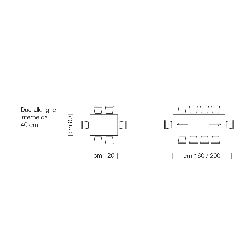 L 120 (200) x P 80 x H 77 cm 10 plazas extensible con dos extensiones internas de 40 cm;
