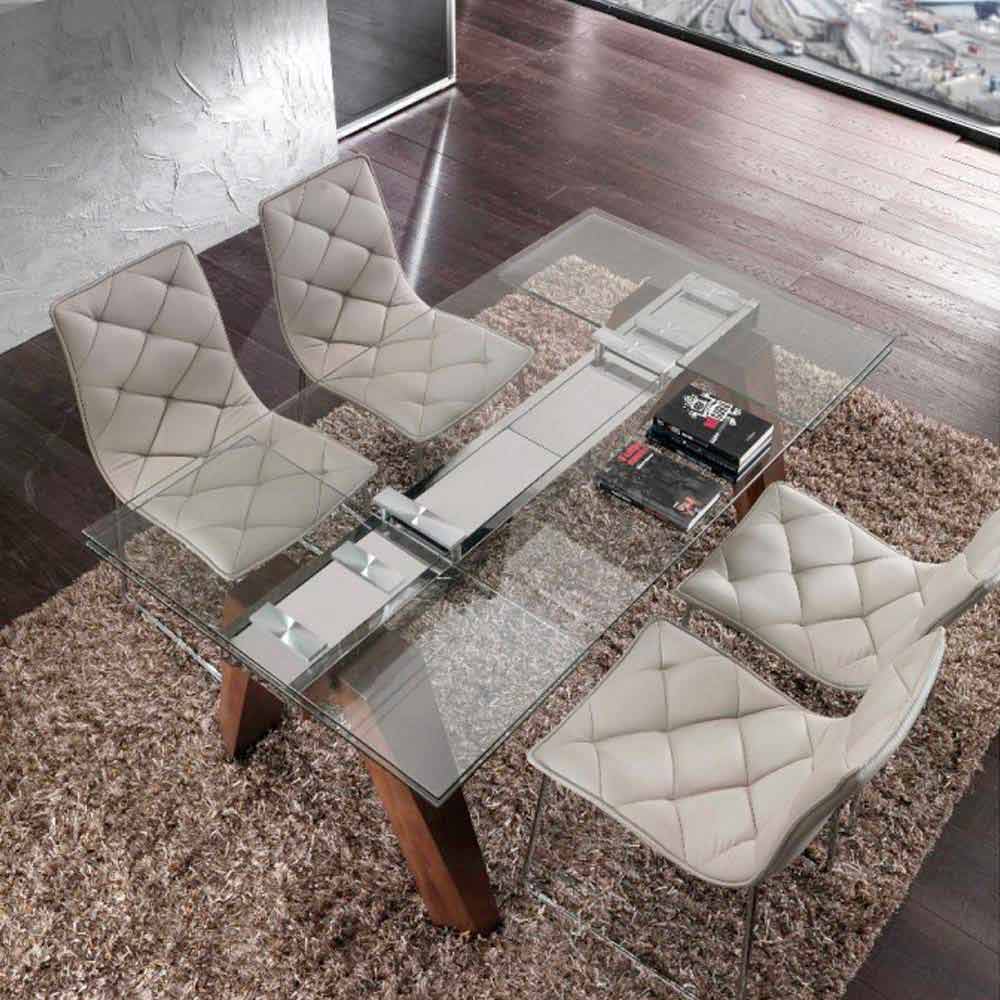 Mesa extensible Chad con tablero de vidrio templado transparente, estructura de acero inoxidable brillante y patas de madera maciza color nuez.