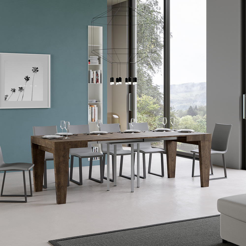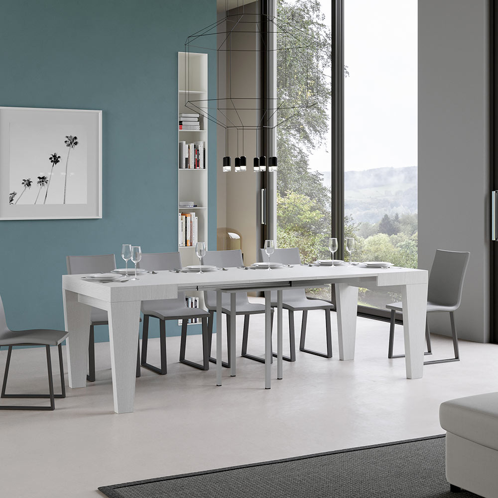 Mesa de comedor extensible fabricada con micropartículas de madera, totalmente Made in Italy. Las extensiones se pueden insertar progresivamente, permitiendo configuraciones de longitud intermedia, por lo que puedes elegir si utilizarlo con una, dos o tres extensiones según tus necesidades de espacio. Cuando no se utilizan, las extensiones deben guardarse en otro lugar y no encuentran sitio dentro de la estructura de la mesa.