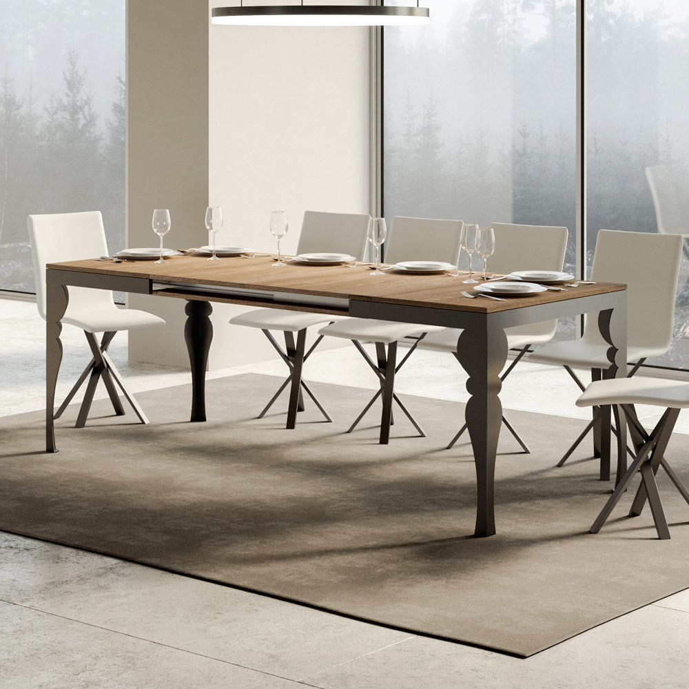 Esta mesa extensible es una muestra de exquisita artesanía, donde el diseño tradicional se encuentra con la funcionalidad moderna. Con sus patas torneadas en un elegante color antracita, esta mesa evoca el estilo clásico, pero con un toque de sofisticación moderna gracias a su tablero de madera.