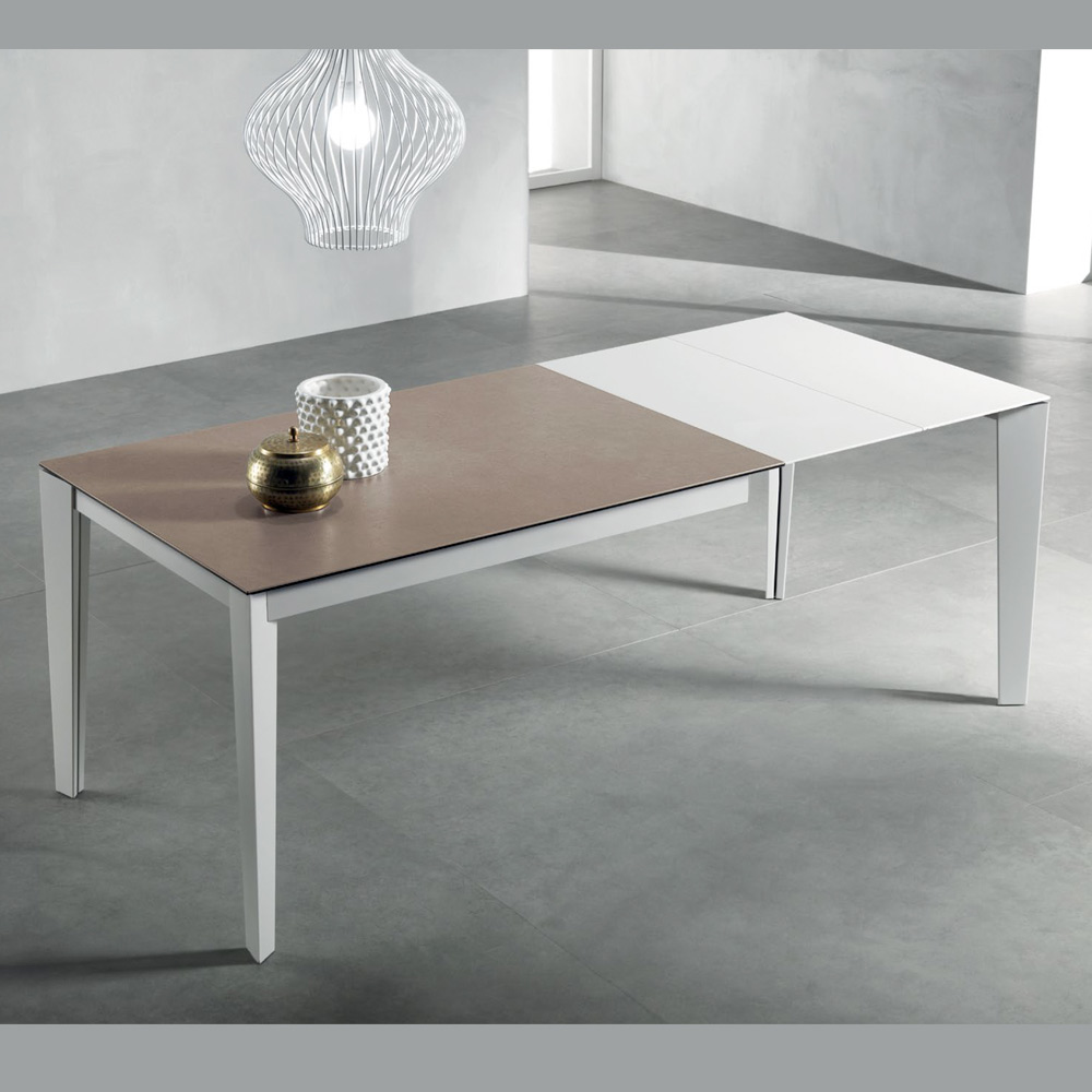 Elegante y funcional, esta mesa rectangular extensible combina diseño moderno y practicidad. Su tablero de vitrocerámica de 10/11 mm de grosor con acabado Fokos Terra , mientras que las patas de metal pintadas en blanco mate aportan estabilidad y un toque contemporáneo.
