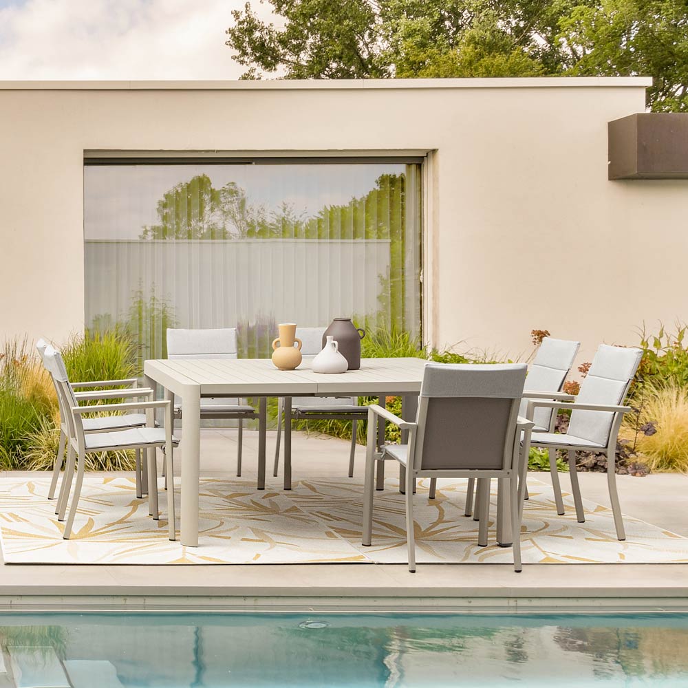 Mesa de exterior con estructura de aluminio pintado en polvo (poliéster), con apertura telescópica.