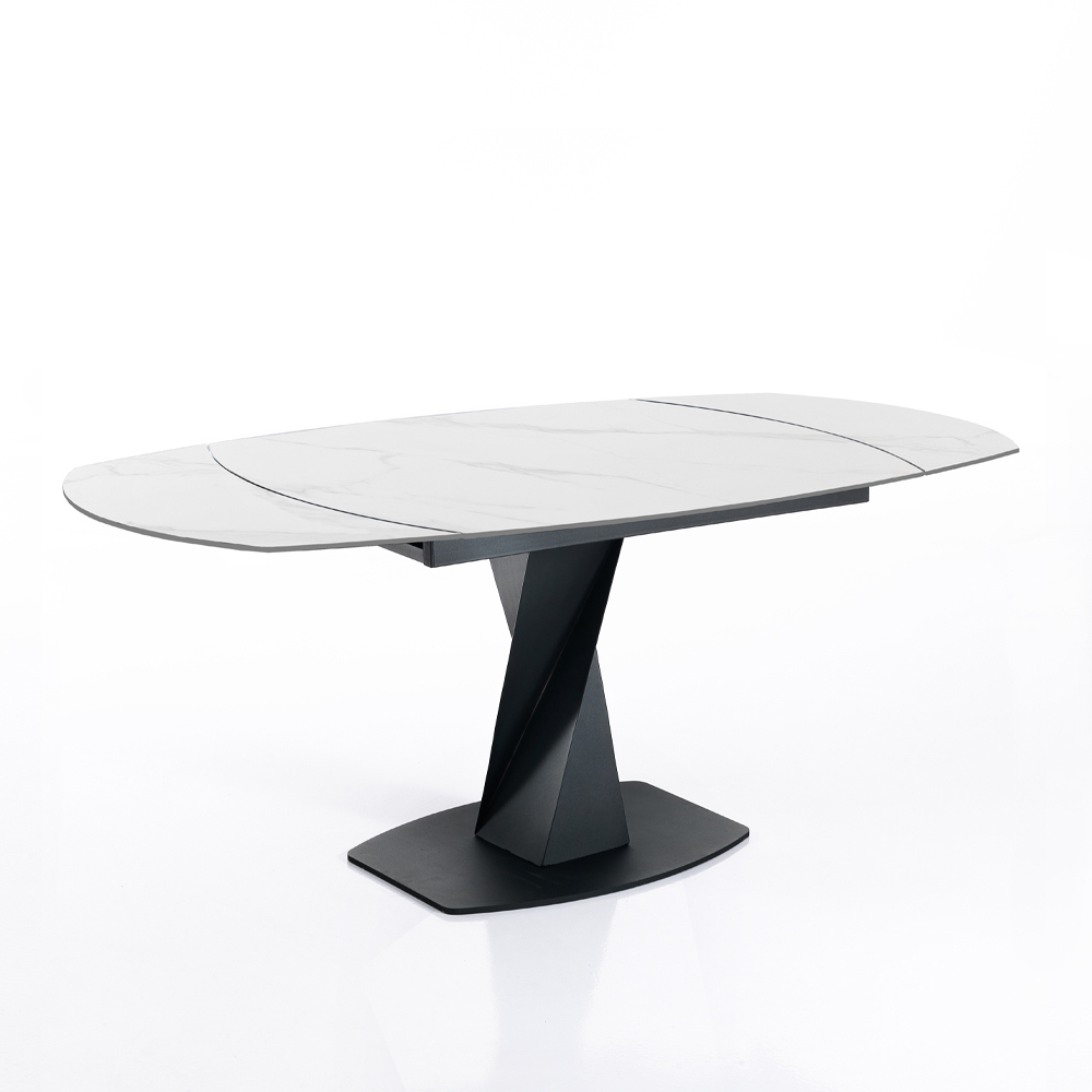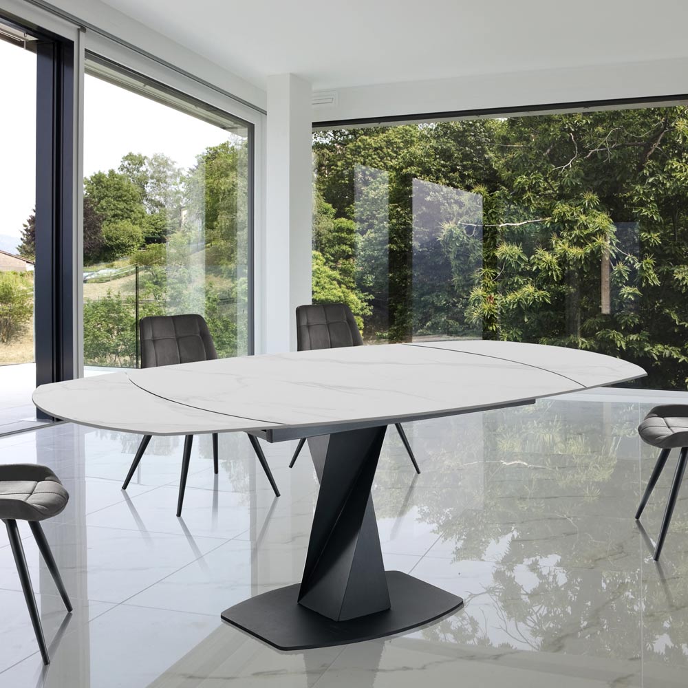 Mesa de interior con tapa realizada en cerámica de 10 mm de espesor con acabado mármol blanco mate , base de metal pintado negro mate y extensión colocada íntegramente bajo el tablero. Este producto es la idea perfecta para todos aquellos que quieran dar un toque de modernidad y frescura al ambiente, ya sea un salón, una cocina o un ambiente contract. Los materiales elegidos para la construcción son de primera calidad para garantizar al cliente una mesa no sólo estética sino también funcional y resistente , que desprende toda la artesanía.