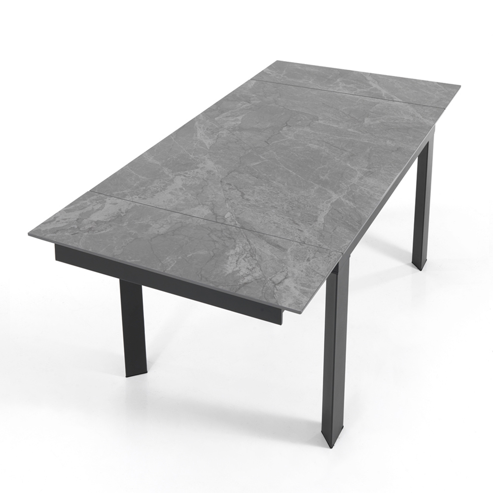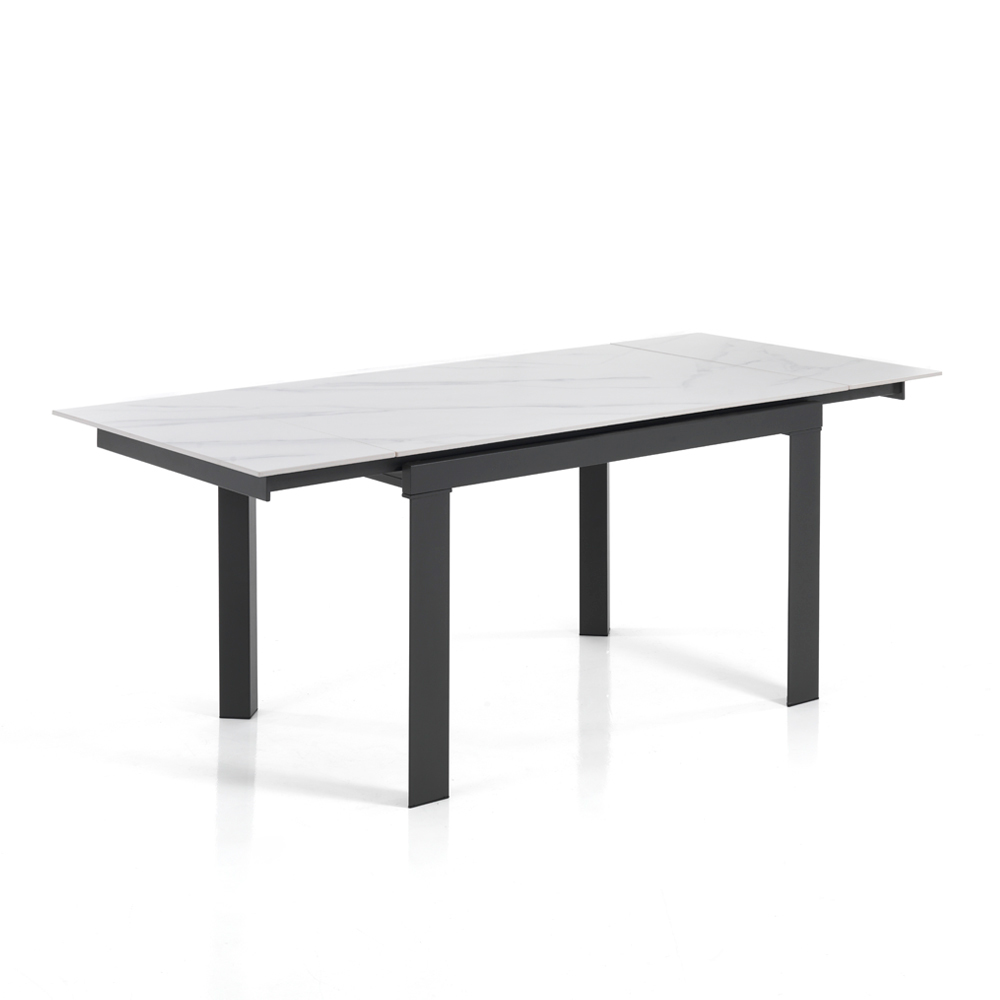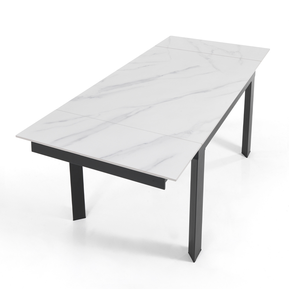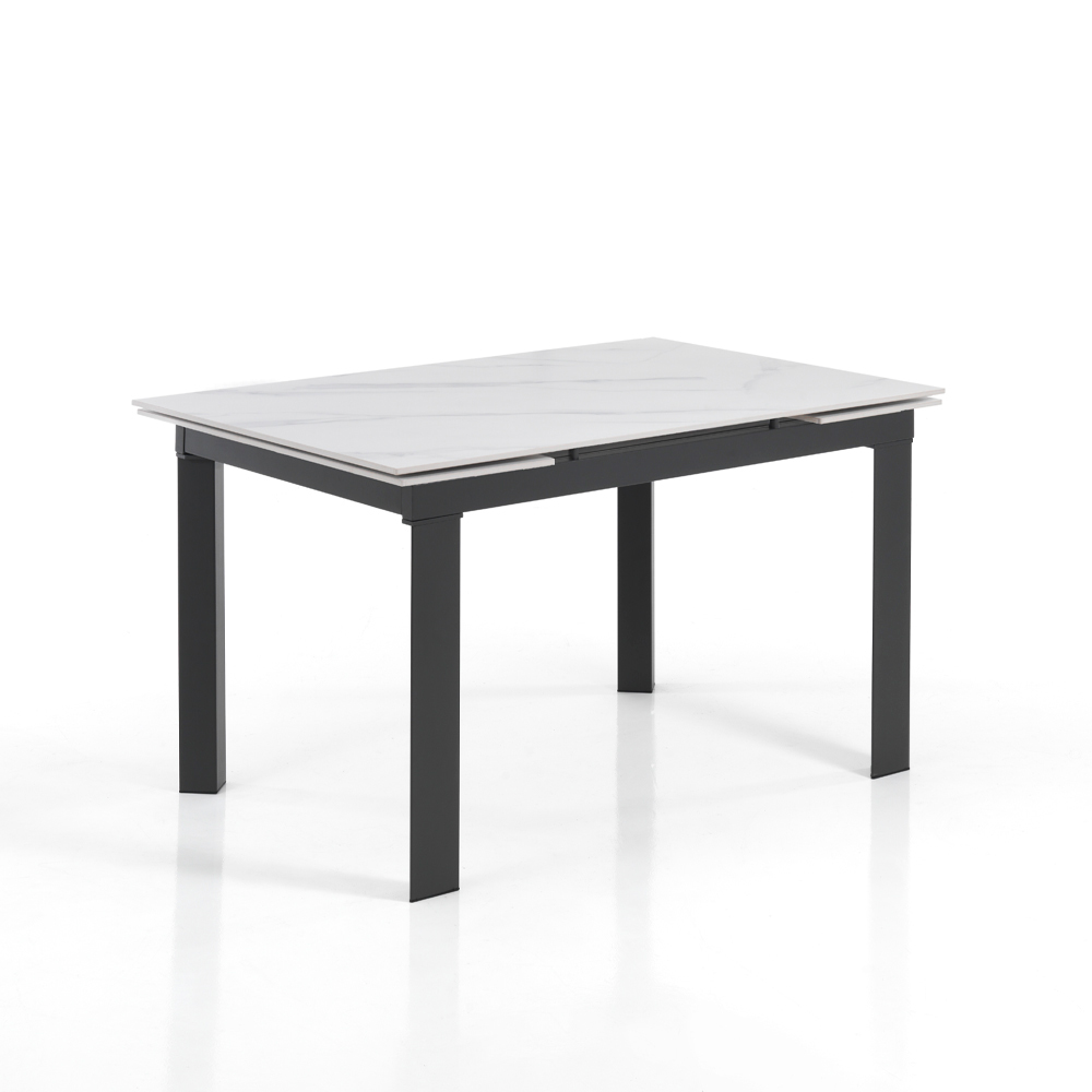 Mesa de interior con tapa de cerámica de 12 mm de espesor, base de acero pintado y extensiones colocadas íntegramente debajo del tablero. Este producto es la idea perfecta para todos aquellos que quieran dar un toque de modernidad y frescura al ambiente, ya sea un salón, una cocina o un ambiente contract. Los materiales elegidos para la construcción son de primera calidad para garantizar al cliente una mesa no sólo bonita a la vista sino también funcional y resistente , que desprende toda la artesanía.