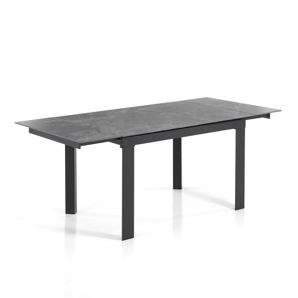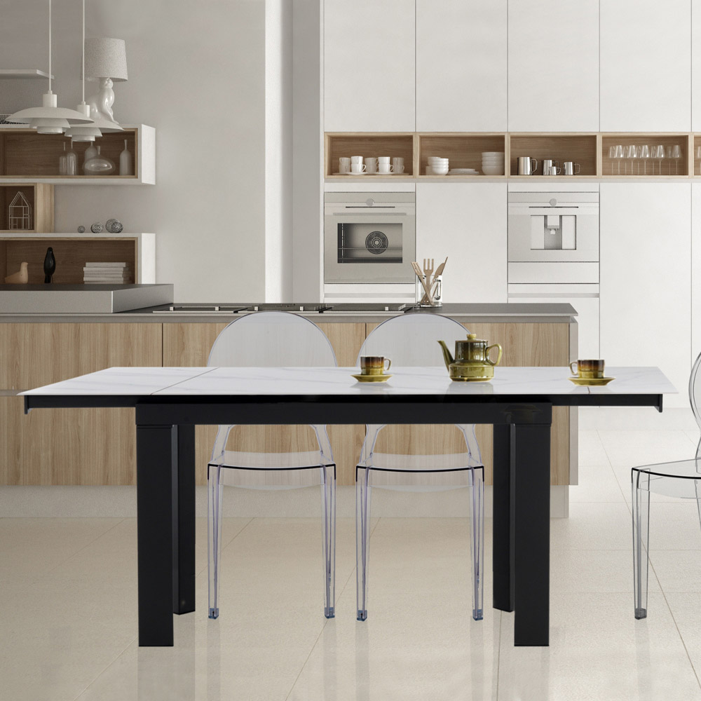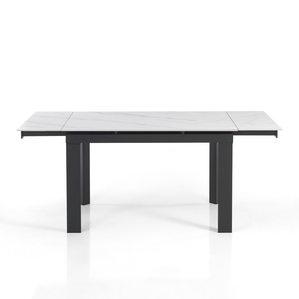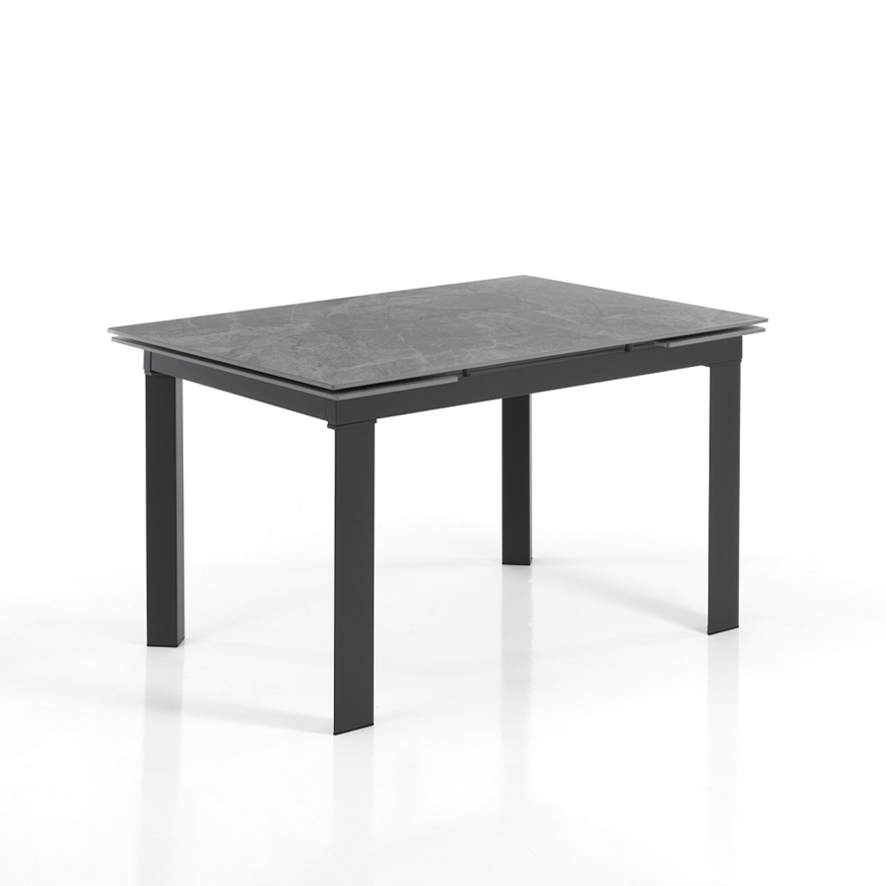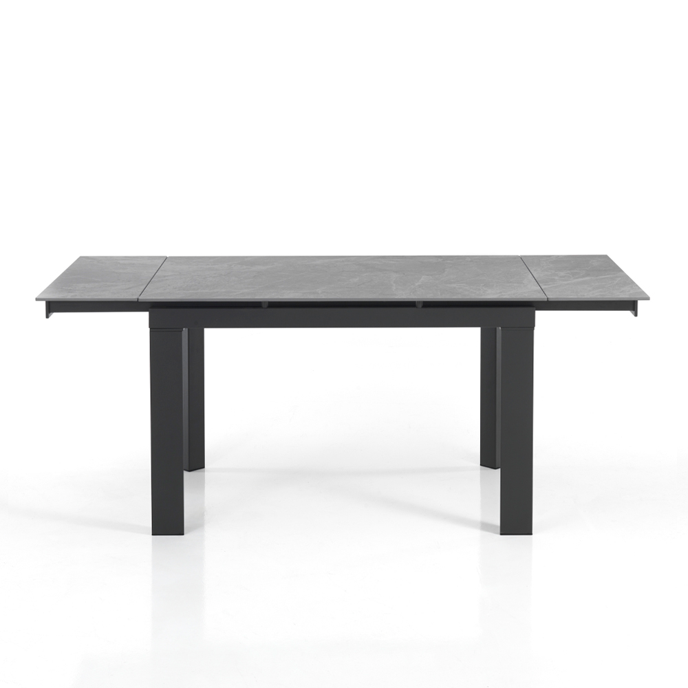 Mesa de interior con tapa de cerámica de 12 mm de espesor, base de acero pintado y extensiones colocadas íntegramente debajo del tablero. Este producto es la idea perfecta para todos aquellos que quieran dar un toque de modernidad y frescura al ambiente, ya sea un salón, una cocina o un ambiente contract. Los materiales elegidos para la construcción son de primera calidad para garantizar al cliente una mesa no sólo bonita a la vista sino también funcional y resistente , que desprende toda la artesanía.