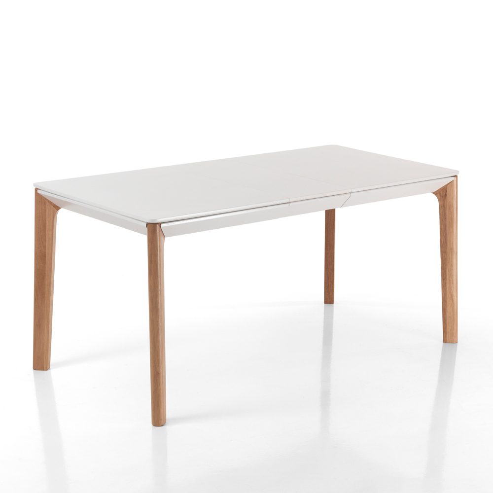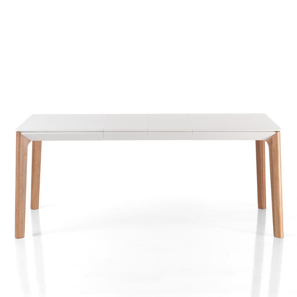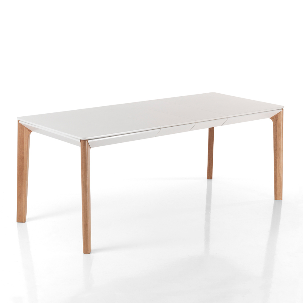 Mesa de interior extensible con tapa de MDF lacado blanco mate de 8,5 cm de espesor, base fabricada en madera maciza acabado roble y 2 extensiones independientes en MDF lacado blanco mate.