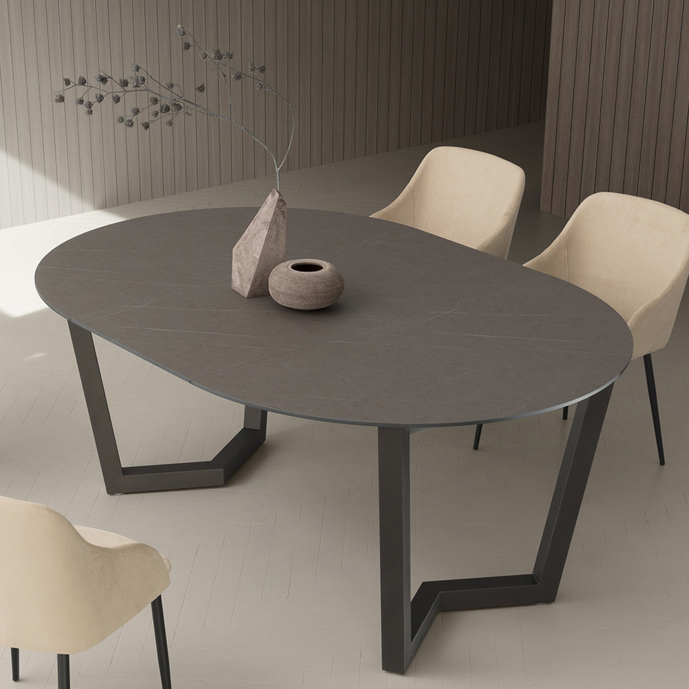 Mesa de comedor con taparedondo , fabricado en Italia en HPL estratificado de 10 mm de espesor con patas de metal pintado con polvos epoxi, acabado moca. Un complemento de decoración caracterizado por una estructura elegante y escultural que surge de la combinación de materiales de diferente naturaleza junto con la pasión por la artesanía.