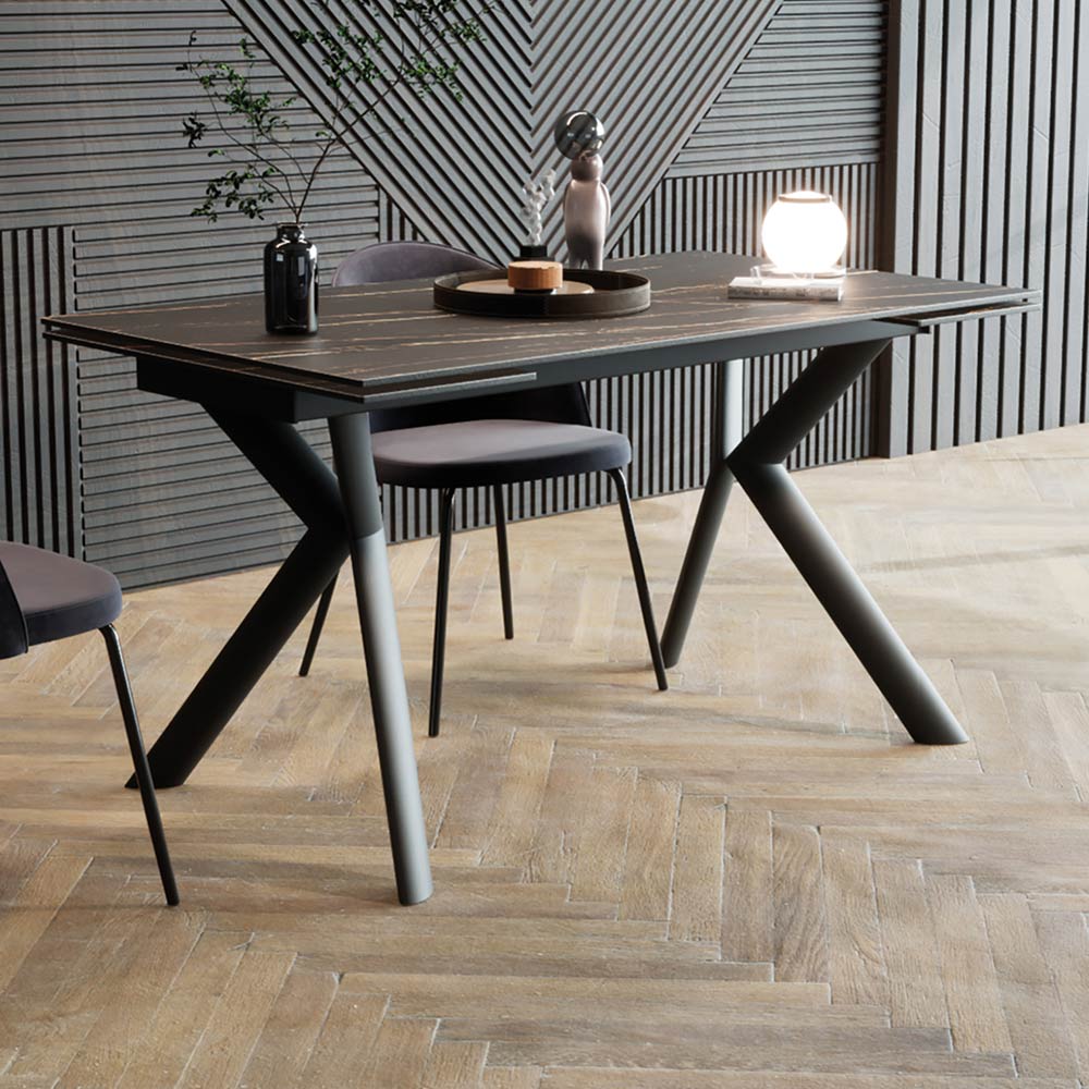Mesa de comedor extensible conestructura de metal pintado antracita y tapa realizada en gres porcelánico acabado sahara noir .Un producto sólido y resistente caracterizado por un diseño exclusivo y moderno, ideal para quienes aman un estilo esencial y versátil, capaz de completar el mobiliario de su comedor o cocina con elegancia y personalidad. Gracias a la maravillosa combinación de materiales y acabados, representa la solución ideal para quienes necesitan un producto funcional pero a la vez de gran impacto visual .