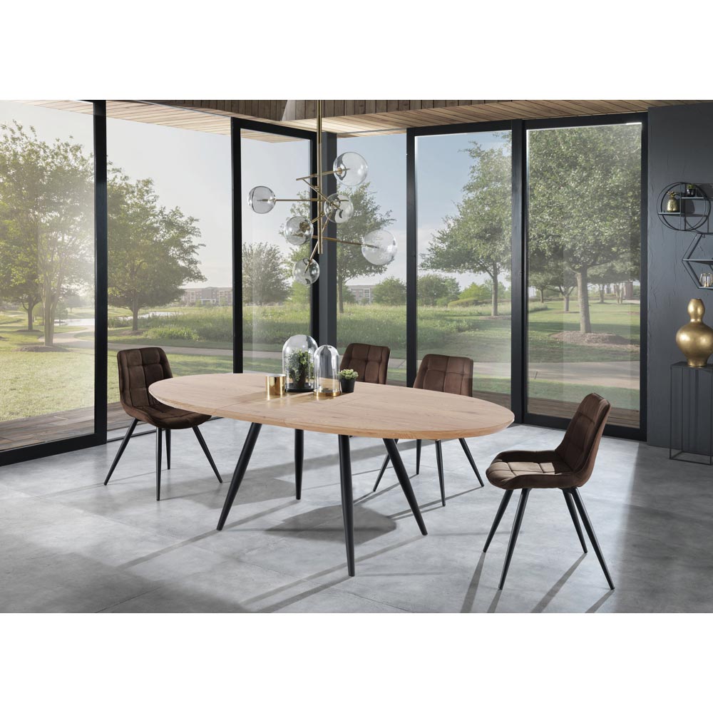 Mesa de interior con tapa de MDF revestida en melamina acabado roble de 4 mm de espesor , base de metal pintado de negro mate y extensión colocada debajo de la tapa, enteramente . Este producto es la idea perfecta para todos aquellos que quieran dar un toque de modernidad y frescura a la estancia, ya sea un salón, una cocina o un ambiente contract. Los materiales elegidos para la construcción son de primera calidad para garantizar al cliente una mesa no sólo estética sino también funcional y resistente , que desprende toda la artesanía.