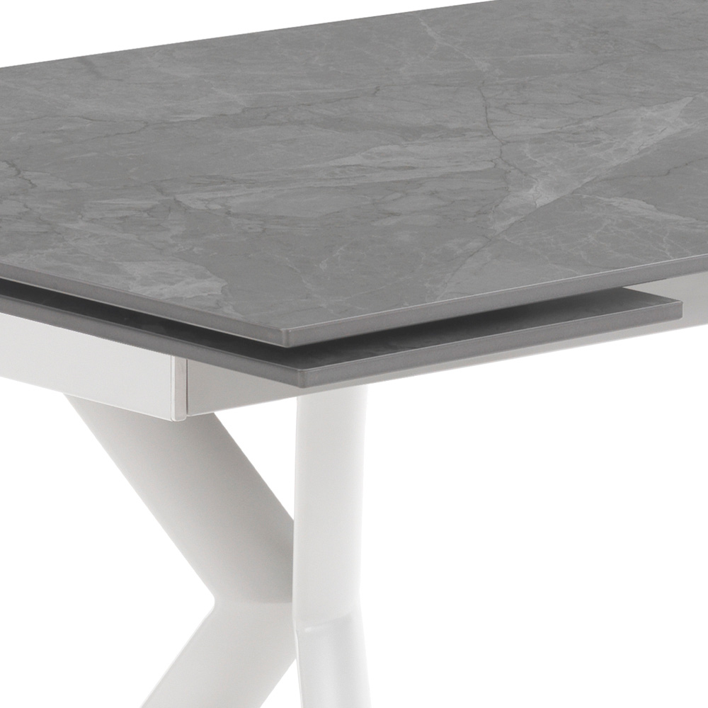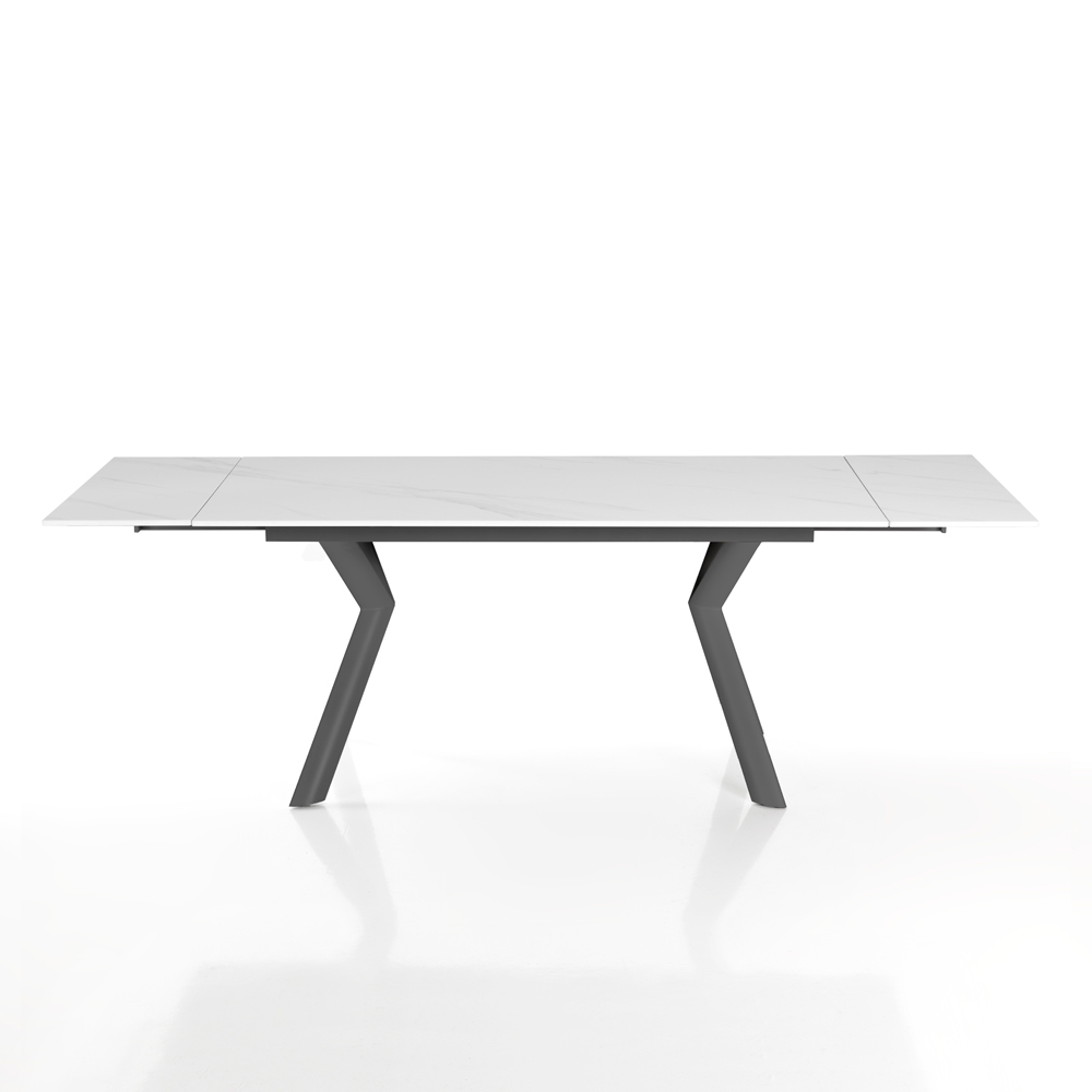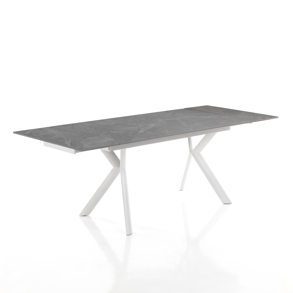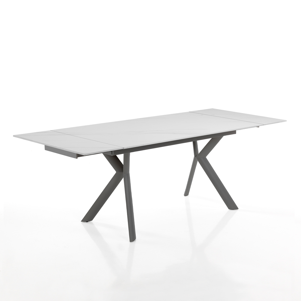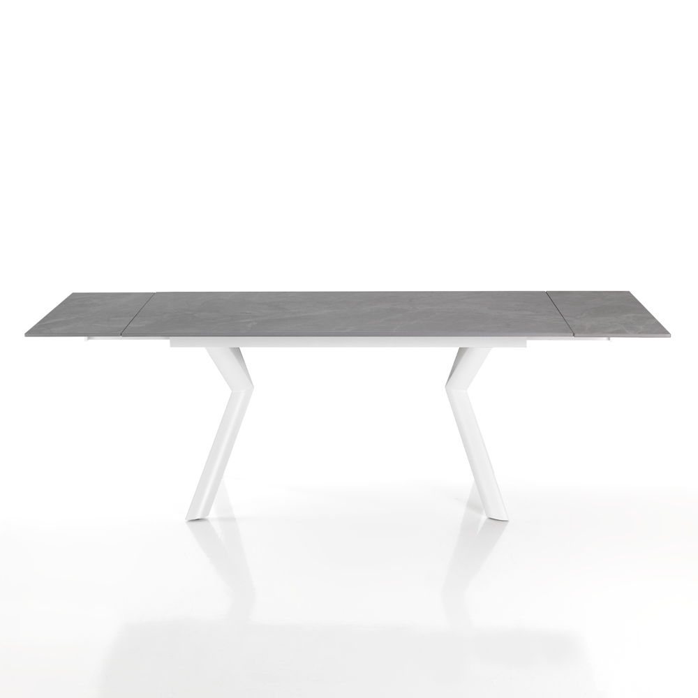 Mesa de interior con tapa de cerámica de 12 mm de espesor, base de acero pintado y extensiones colocadas íntegramente debajo del tablero. Este producto es la idea perfecta para todos aquellos que quieran dar un toque de modernidad y frescura al ambiente, ya sea un salón, una cocina o un ambiente contract. Los materiales elegidos para la construcción son de la más alta calidad para garantizar al cliente una mesa no sólo bella a la vista sino también funcional y resistente , que libera toda la artesanía de la.