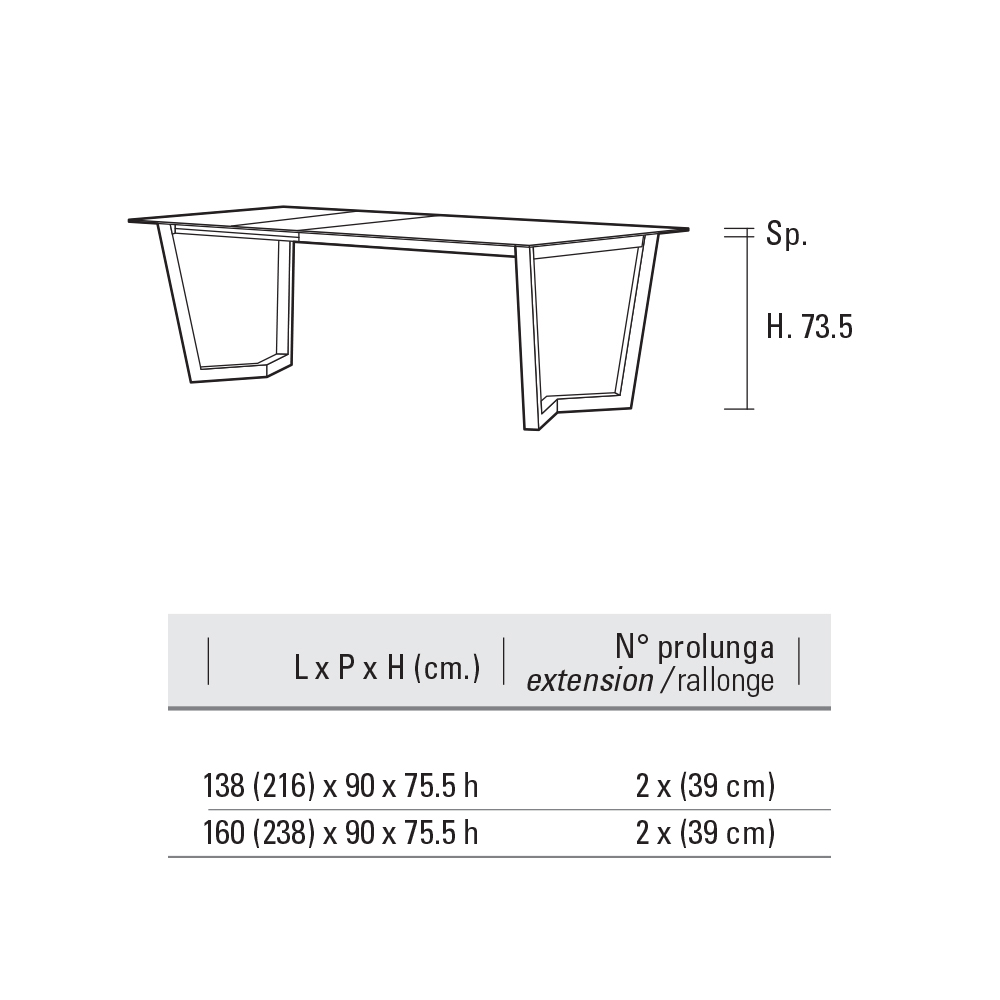 - Largo 160/238 x Fondo 90 x Alto 75,5 cm.