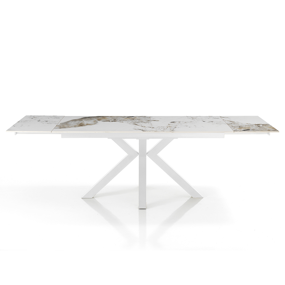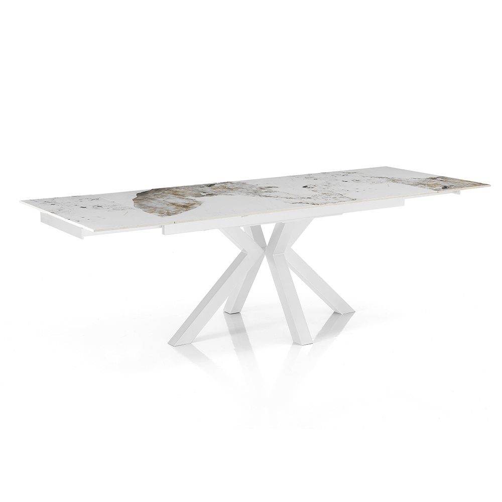 Esta mesa extensible es una obra maestra del diseño contemporáneo, que combina elegancia y funcionalidad en una sola pieza de mobiliario de lujo. El tablero, realizado en cerámica efecto mármol, se caracteriza por intrincados vetas que confieren singularidad y personalidad a cada pieza.