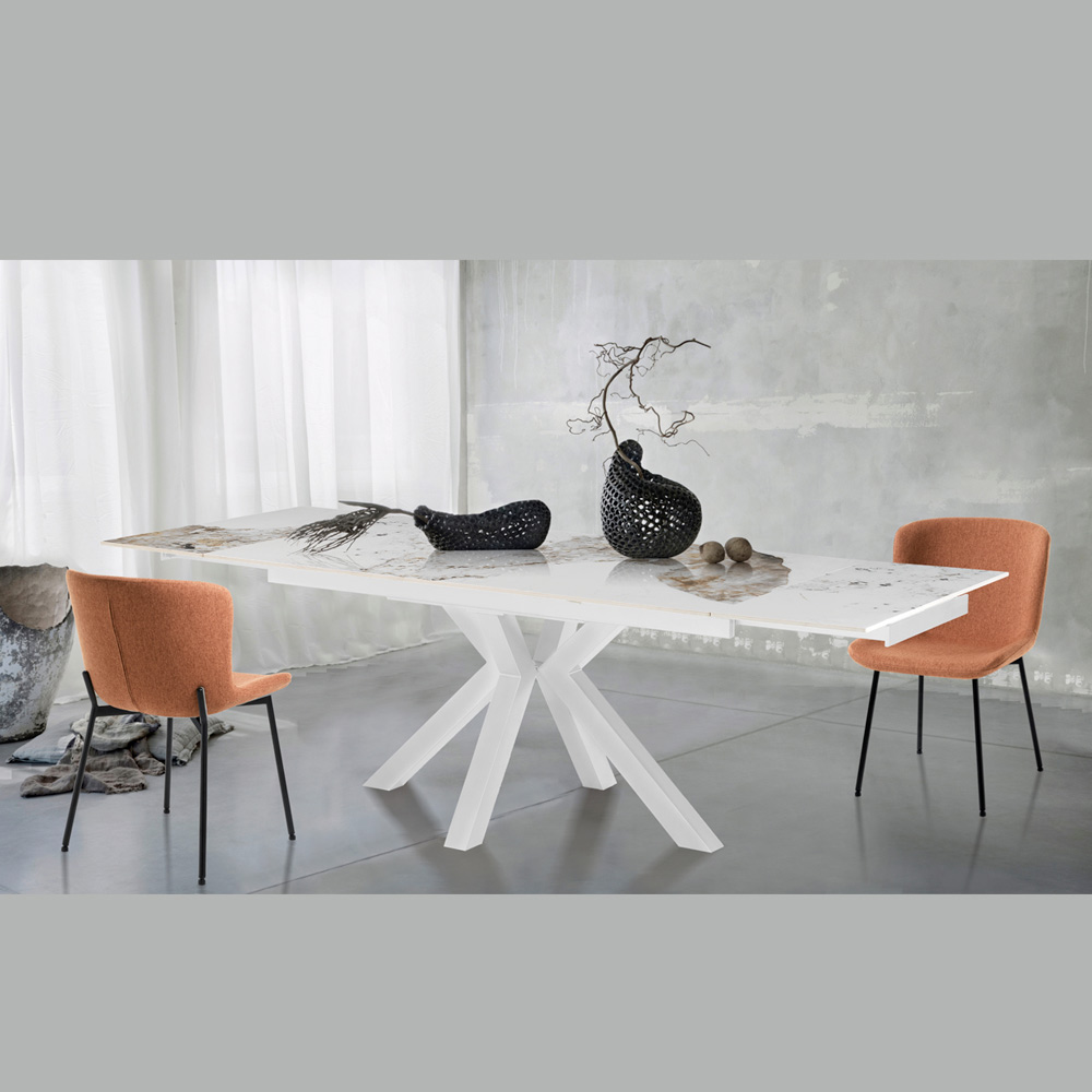 La base de la mesa, de metal pintado de blanco, presenta una estructura en forma de X que no sólo garantiza estabilidad y soporte, sino que también añade un elemento de diseño escultórico al conjunto. Esta combinación de materiales no sólo asegura durabilidad y resistencia en el tiempo sino también un toque visualmente impactante que puede transformar cualquier comedor o zona de reuniones.