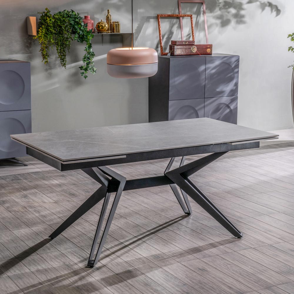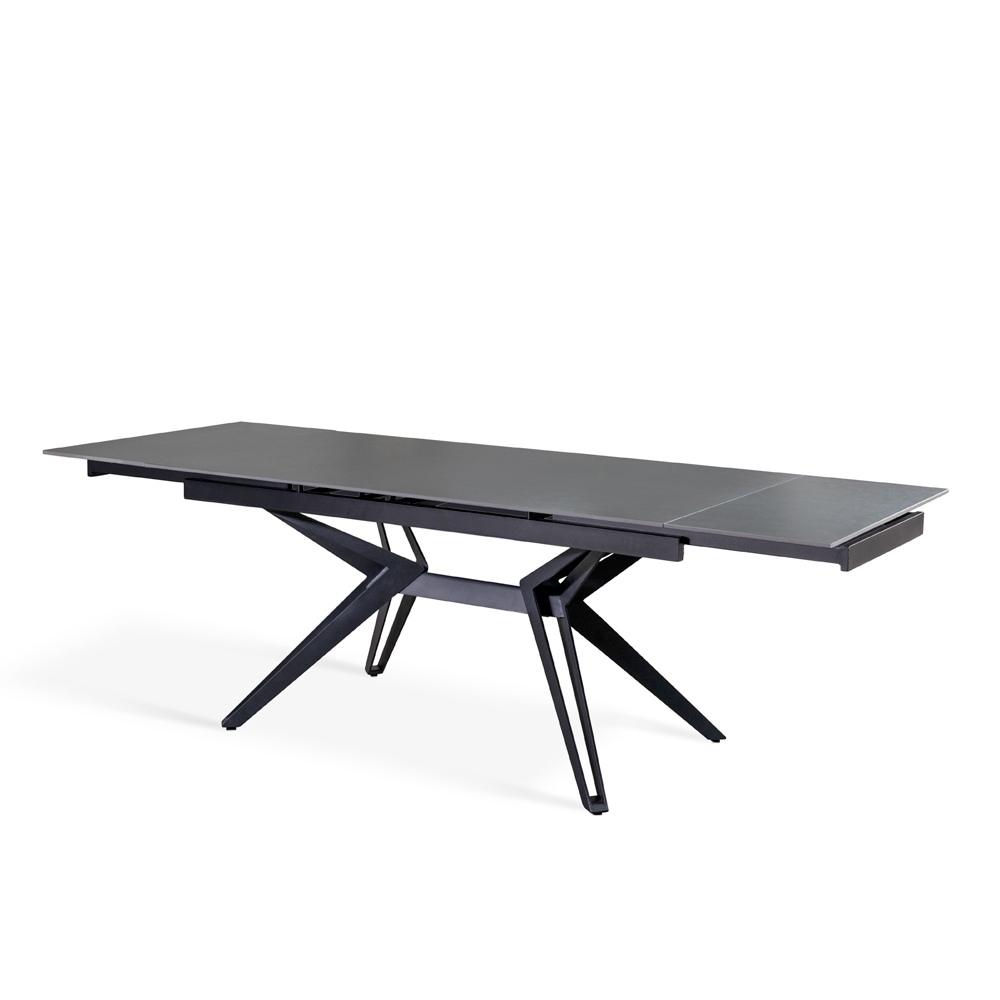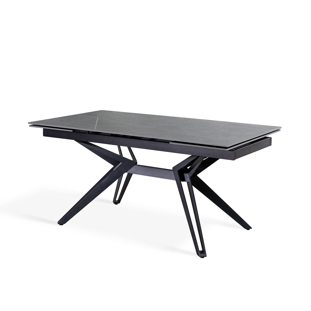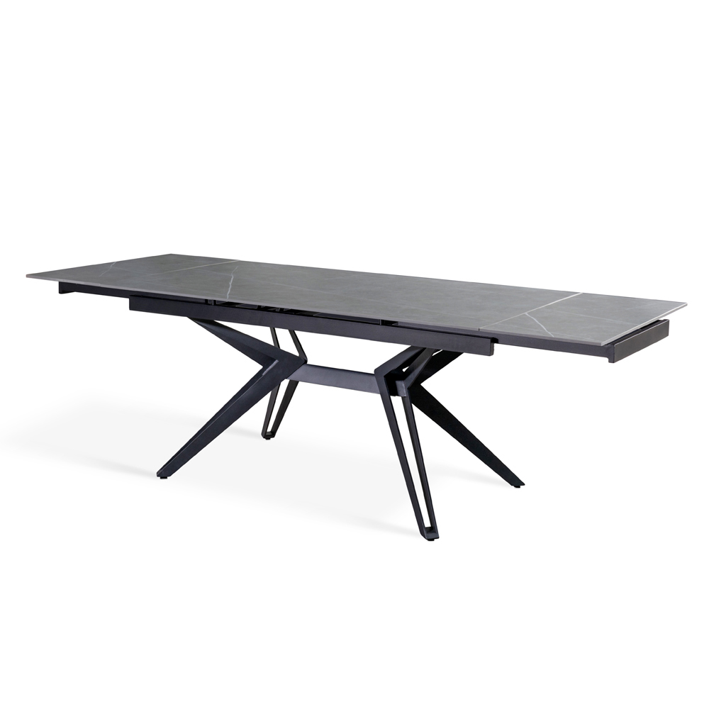 Mesa de salón extensible con tapa de cerámica , patas de estrella de metal y extensiones de cerámica retráctiles.