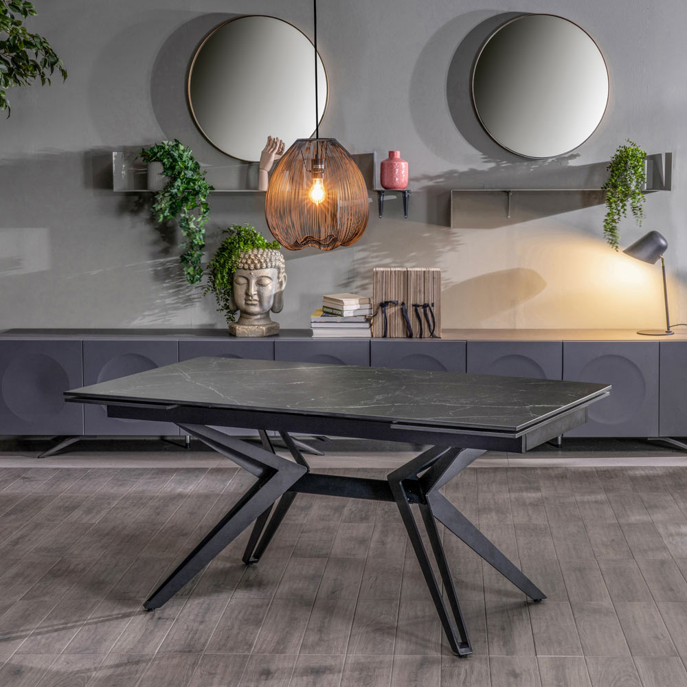 Lo que llama la atención es la fuerza expresiva de esta mesa extensible de estilo contemporáneo e industrial. Su diseño se caracteriza por la elegante tapa de cerámica que combina con buen gusto con la sólida base de metal. Ofrece muchas combinaciones posibles entre los acabados de la tapa rectangular y el acabado de la base, satisfaciendo la expresión y el gusto personal y reflejando el espíritu del contexto en el que se inserta. Gracias a su extensibilidad puede acoger hasta 10 personas, y se convierte en el aliado perfecto para crear espacios de convivencia únicos y cálidos.