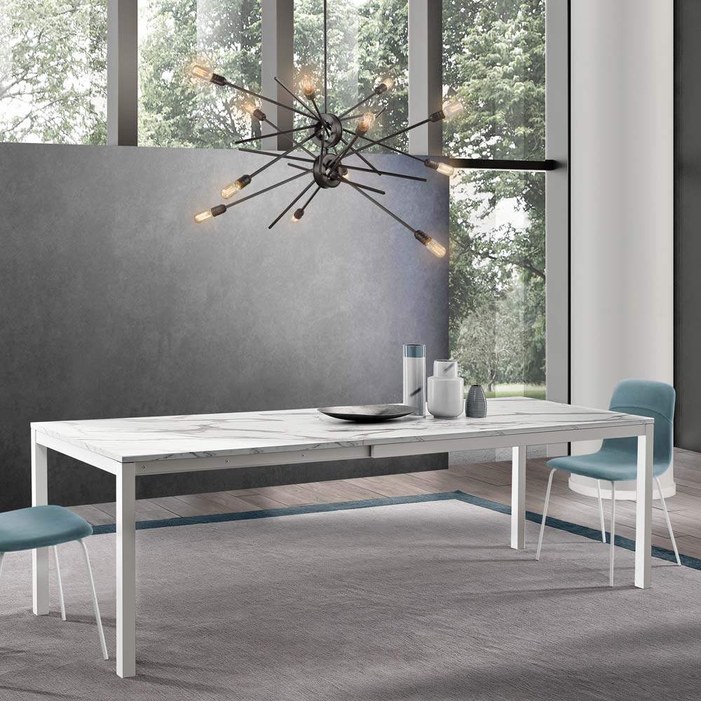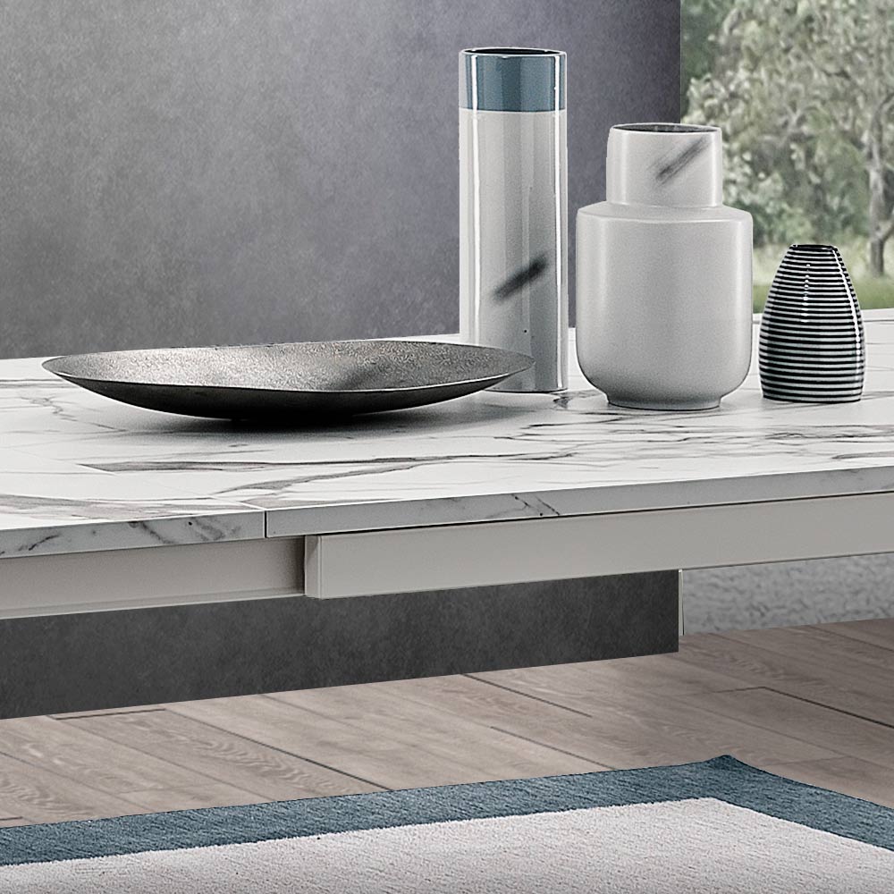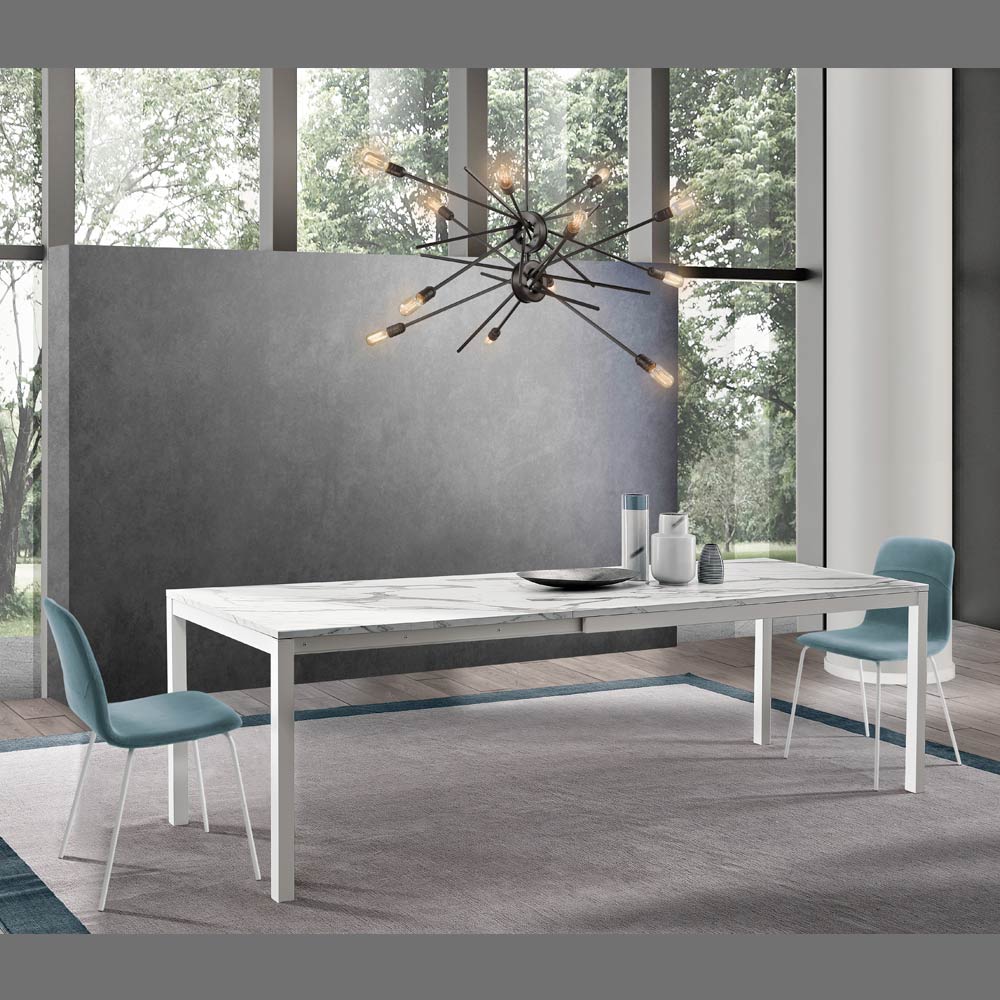 Aquí hay una mesa de comedor que celebra el brillo y la pureza del diseño moderno. Con una impresionante superficie de melamina efecto calacatta , esta pieza eleva cualquier estancia, fusionando la robustez del material con la ligereza visual que ofrecen las patas de metal blanco . La apariencia es limpia, minimalista, pero rica en detalles, como la veta sutil y natural que recorre delicadamente la superficie, ofreciendo una combinación perfecta de funcionalidad y estética sofisticada.