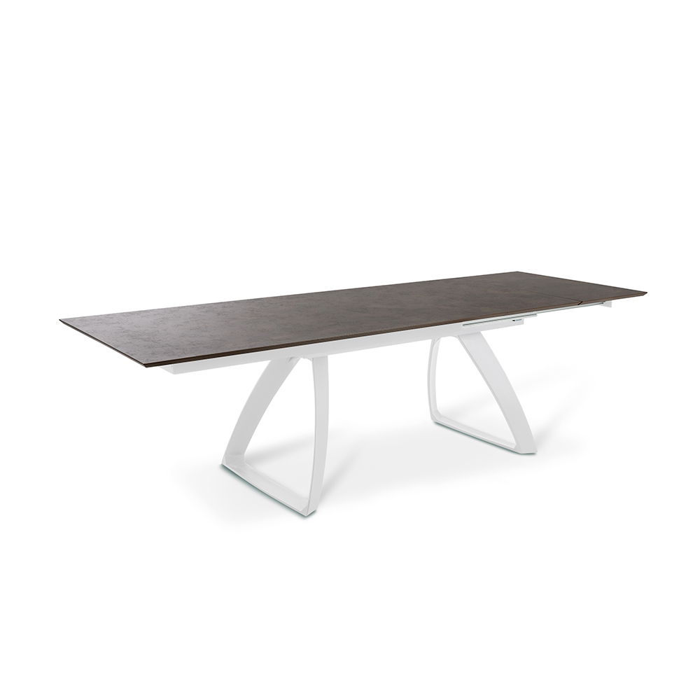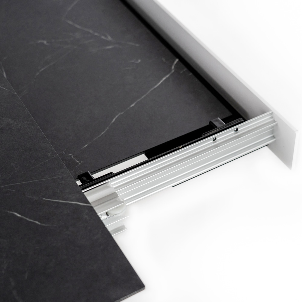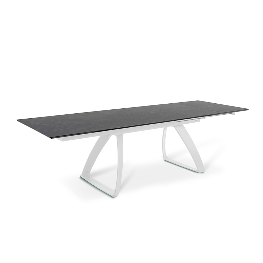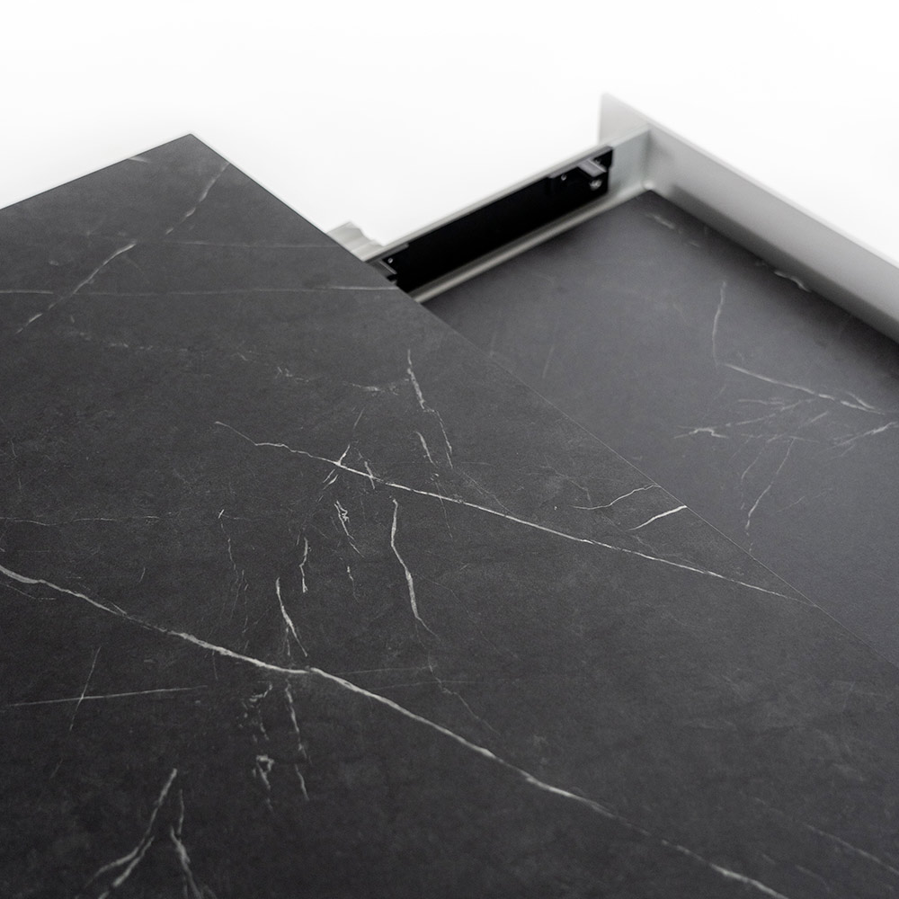 Mesa de salón extensible con tapa de HPL sobre MDF , patas de aluminio pintado blanco o negroy extensiones internas en HPL sobre MDF.