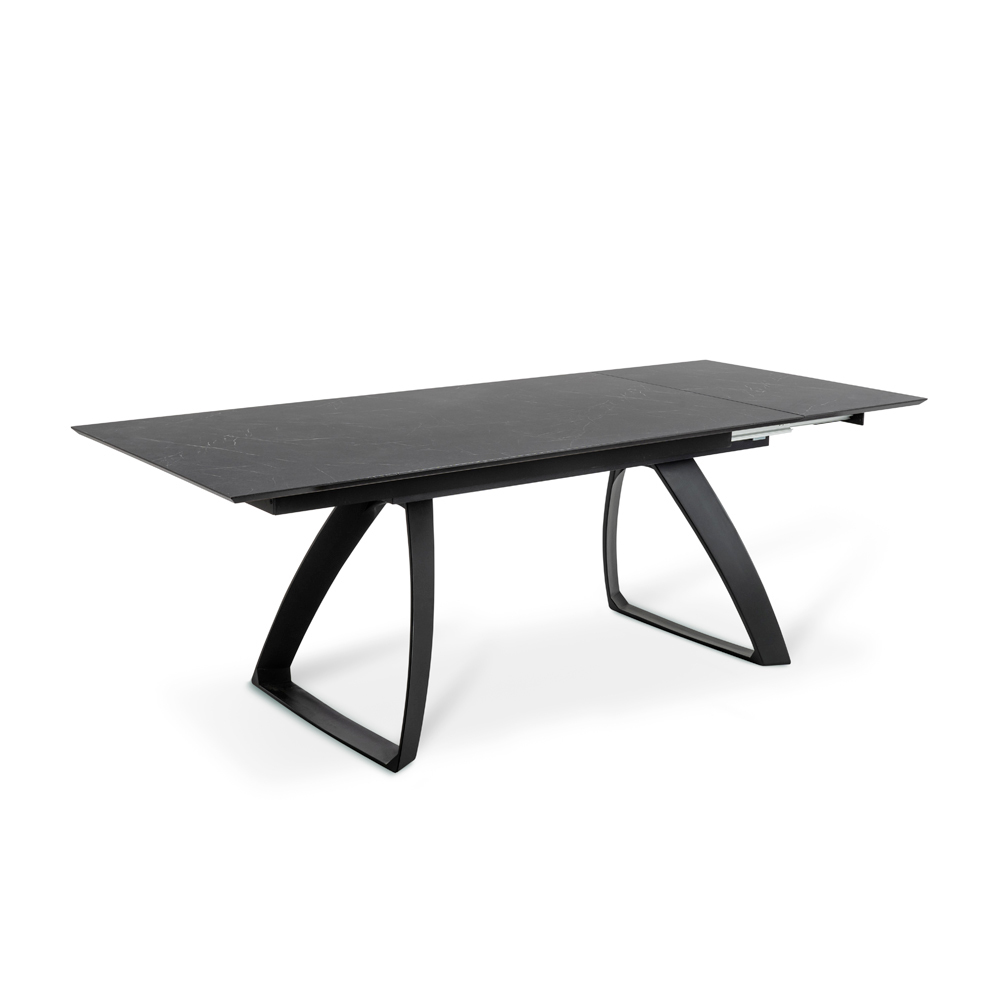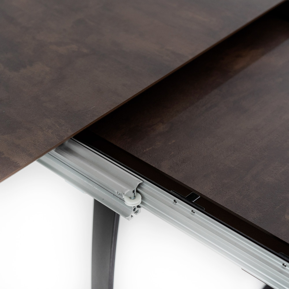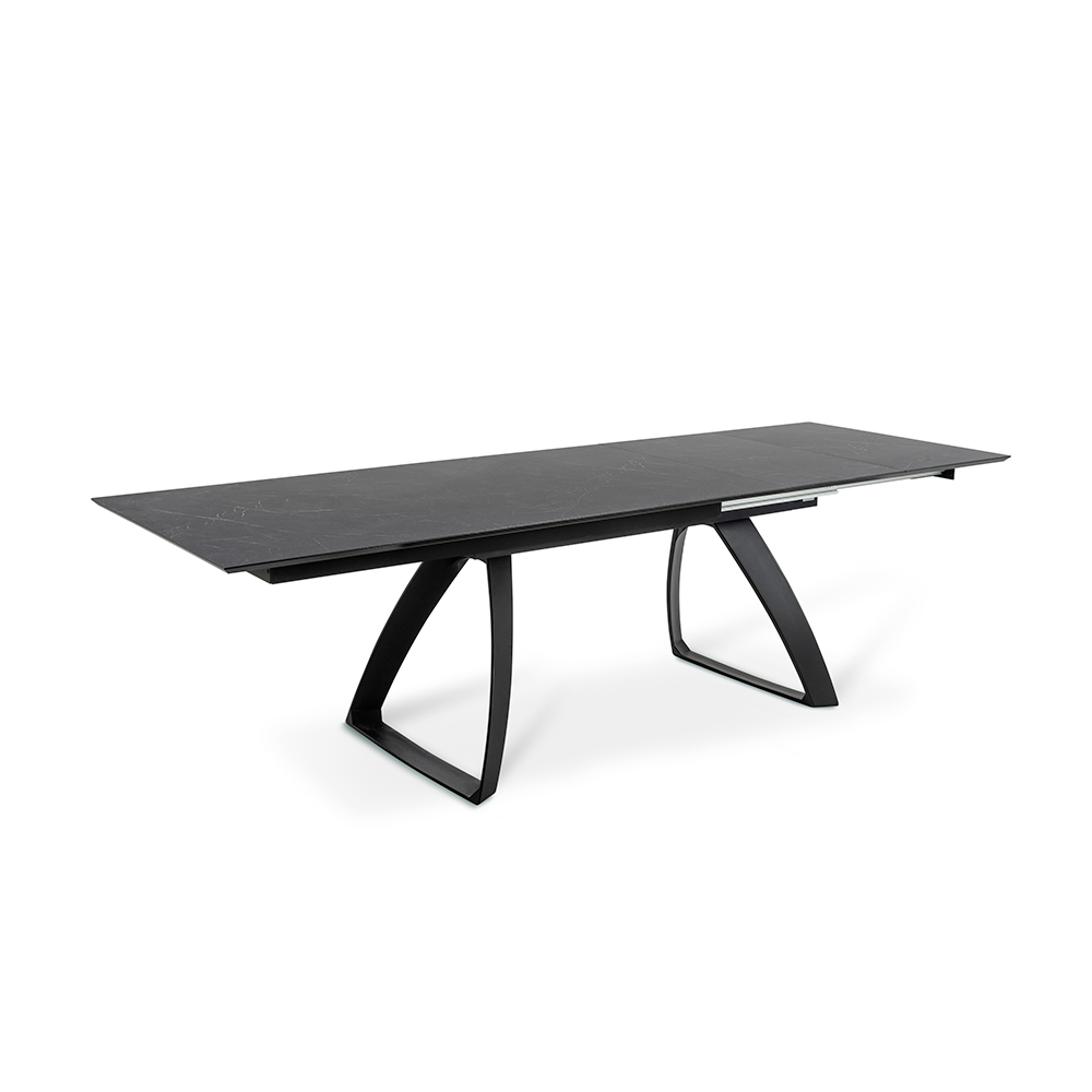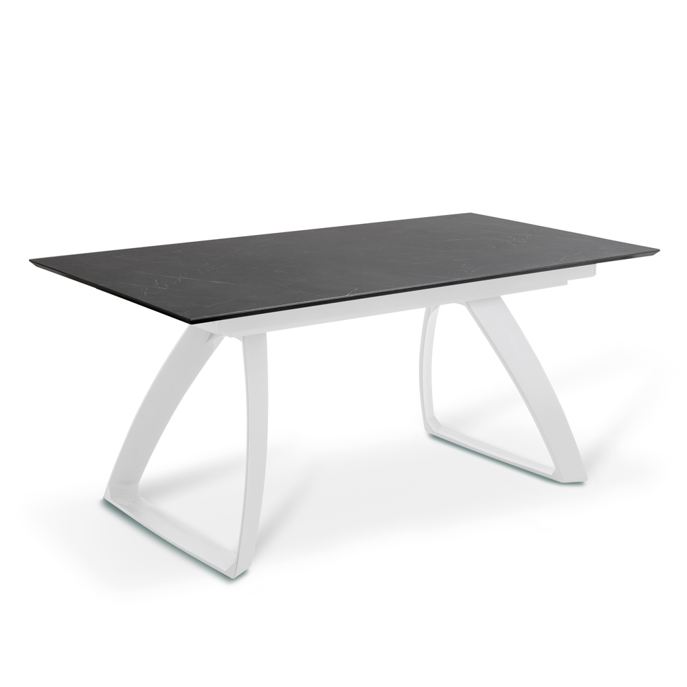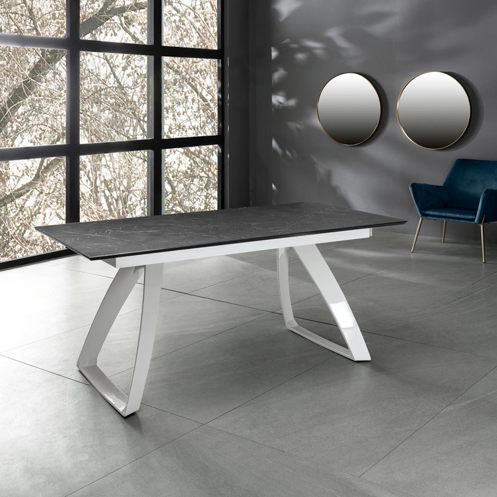 Mesa de salón extensible con tapa de HPL sobre MDF , patas de aluminio pintado blanco o negroy extensiones internas en HPL sobre MDF.