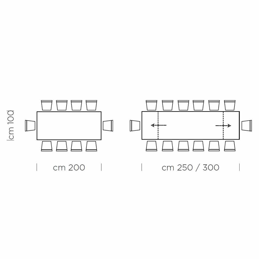 • L 200/300 x P 100 x H 75,5 cm 14 plazas (2 extensiones de 50 cm).