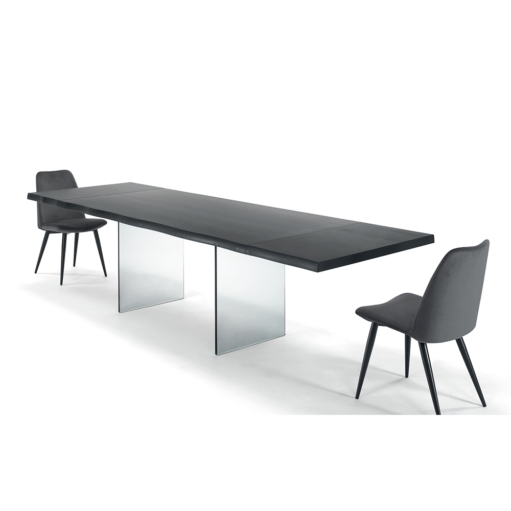 Mesa de comedor extensible hasta 300 cm con tapa de madera chapada y base de cristal fabricada en Italia.
