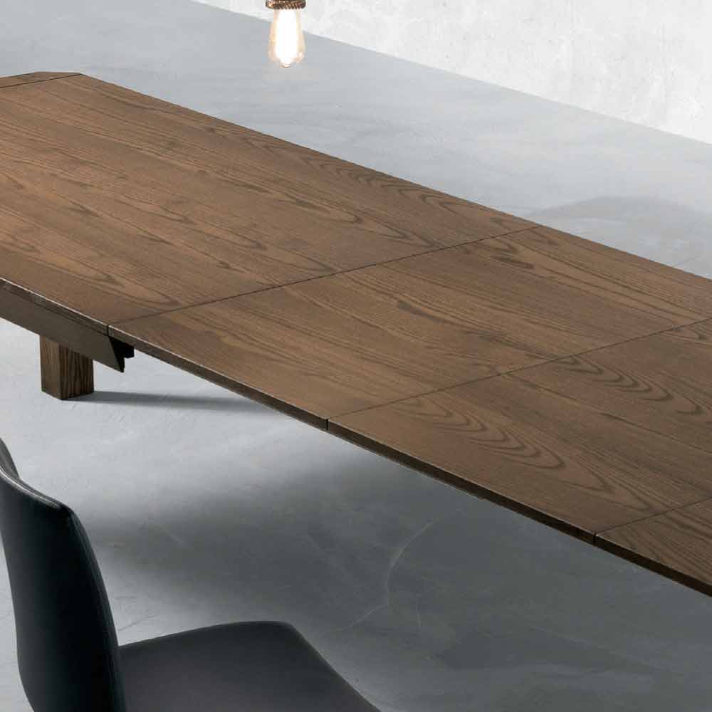 Producida íntegramente en Italia con patas trapezoidales y tapa chapada en fresno de 20 mm de espesor disponible en 4 acabados diferentes: