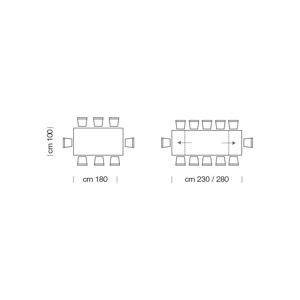 L 180 (280) x P 100 x H 75,3 cm 12 plazas extensible con 2 extensiones externas de 50 cm;