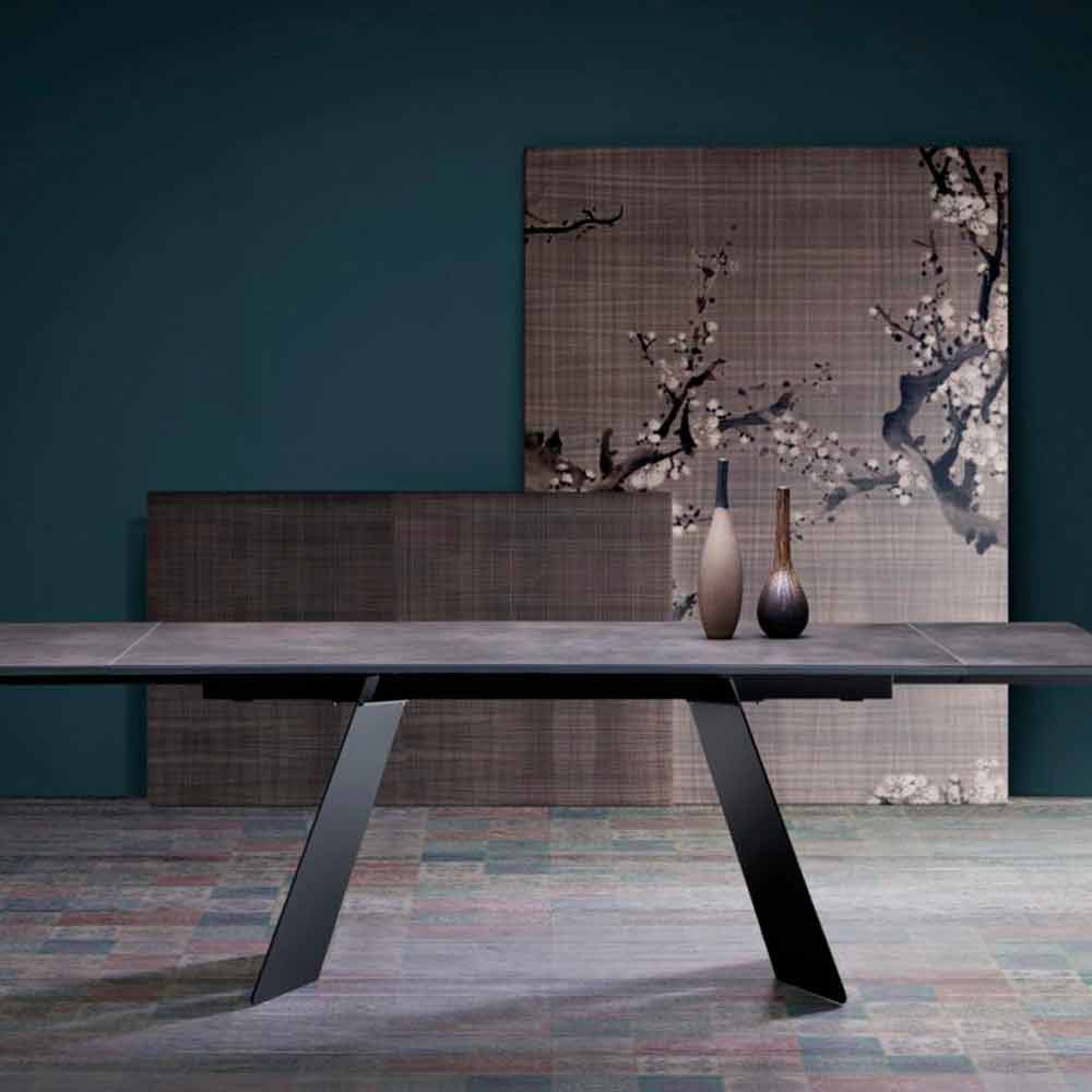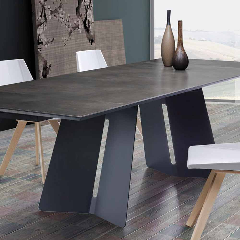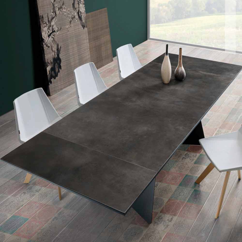 Mesa extensible de diseño moderno con tapa de gres, Erve. Erve es una maravillosa mesa extensible con un diseño moderno, innovador y al mismo tiempo tradicional, perfecta para colocar en cualquier entorno.