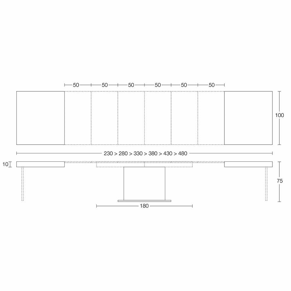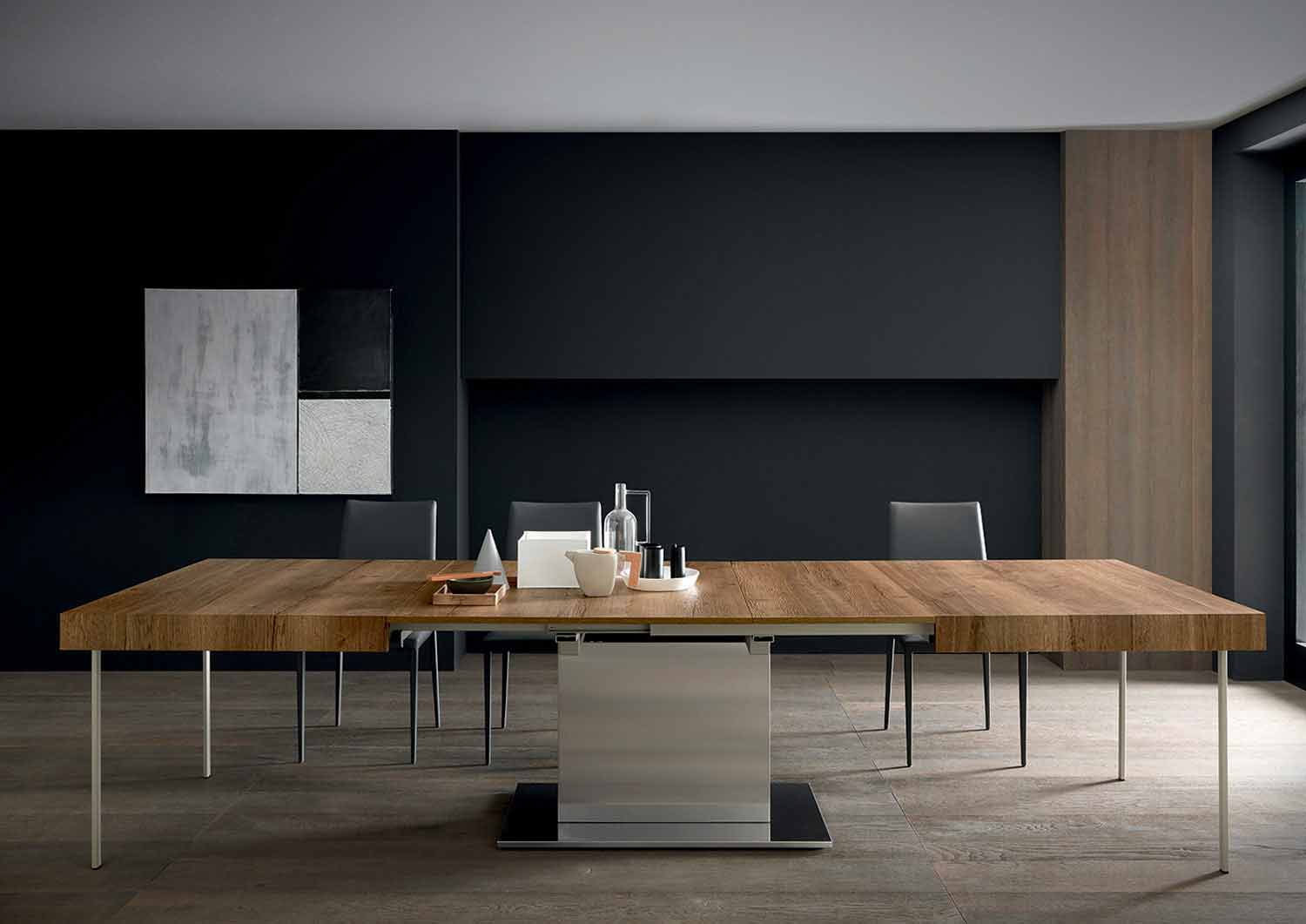 Esta mesa extensible se perfila con un diseño pequeño y discreto para la versión de salón, pero que sabe sorprender y regalar grandes emociones en la versión abierta. Su característica peculiar, de hecho, consiste en poder extenderse por un total de 480 metros, para albergar realmente a todos los invitados que desee.