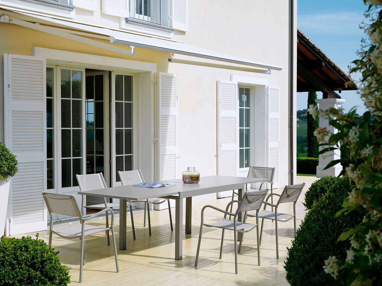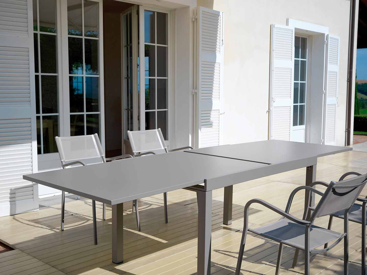 Mesa de exterior extensible hasta 280 cm en hierro galvanizado pintado con polvo. Fabricada en Italia.
