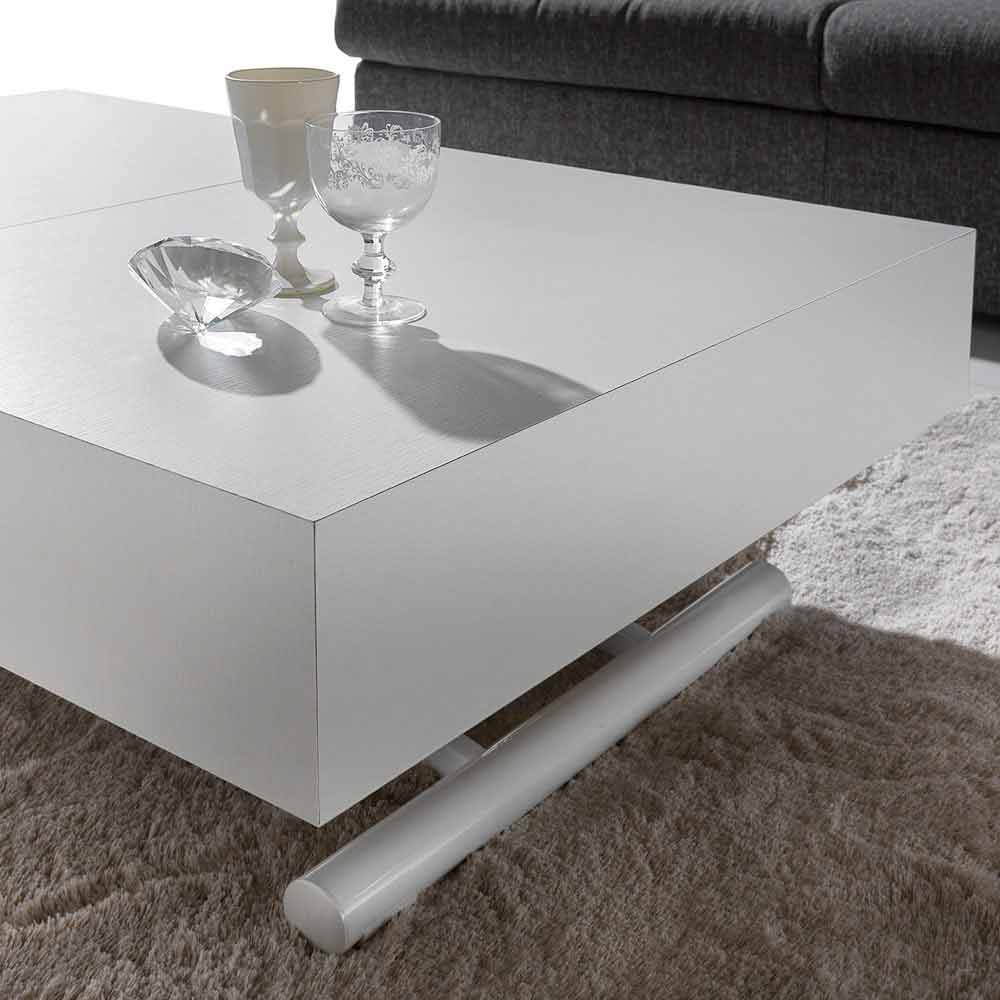 Mesa extensible con altura regulable a través de elevación a gas. Posibilidad de uso como mesa de comedor o mesita. Estructura de metal y tablero de madera High Quality.